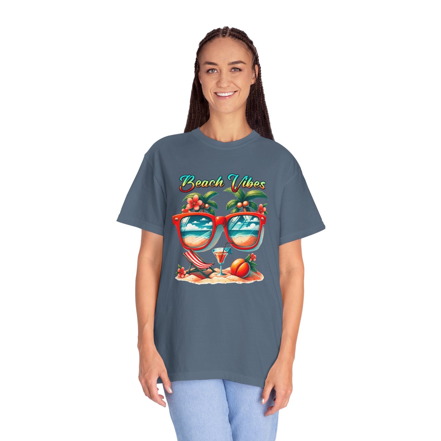Embrace the summer spirit with our ‘Beach Vibes’ tropical t-shirt. This unique design features stylized text and a captivating graphic of sunglasses reflecting a serene beach scene. The shirt is further adorned with tropical flower accents, adding a touch of exotic charm. Perfect for beach lovers and sun seekers, this t-shirt is your ticket to a never-ending summer. Made from comfortable materials, it’s perfect for your next vacation or as a daily reminder of the ocean’s allure.