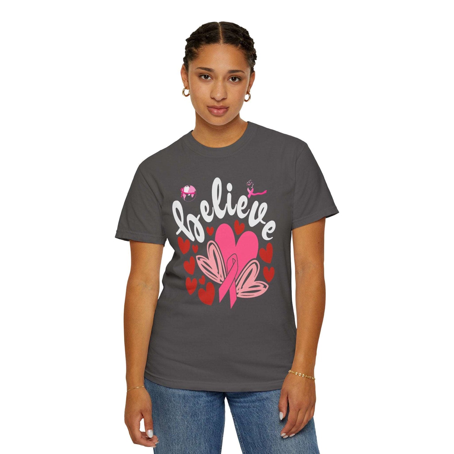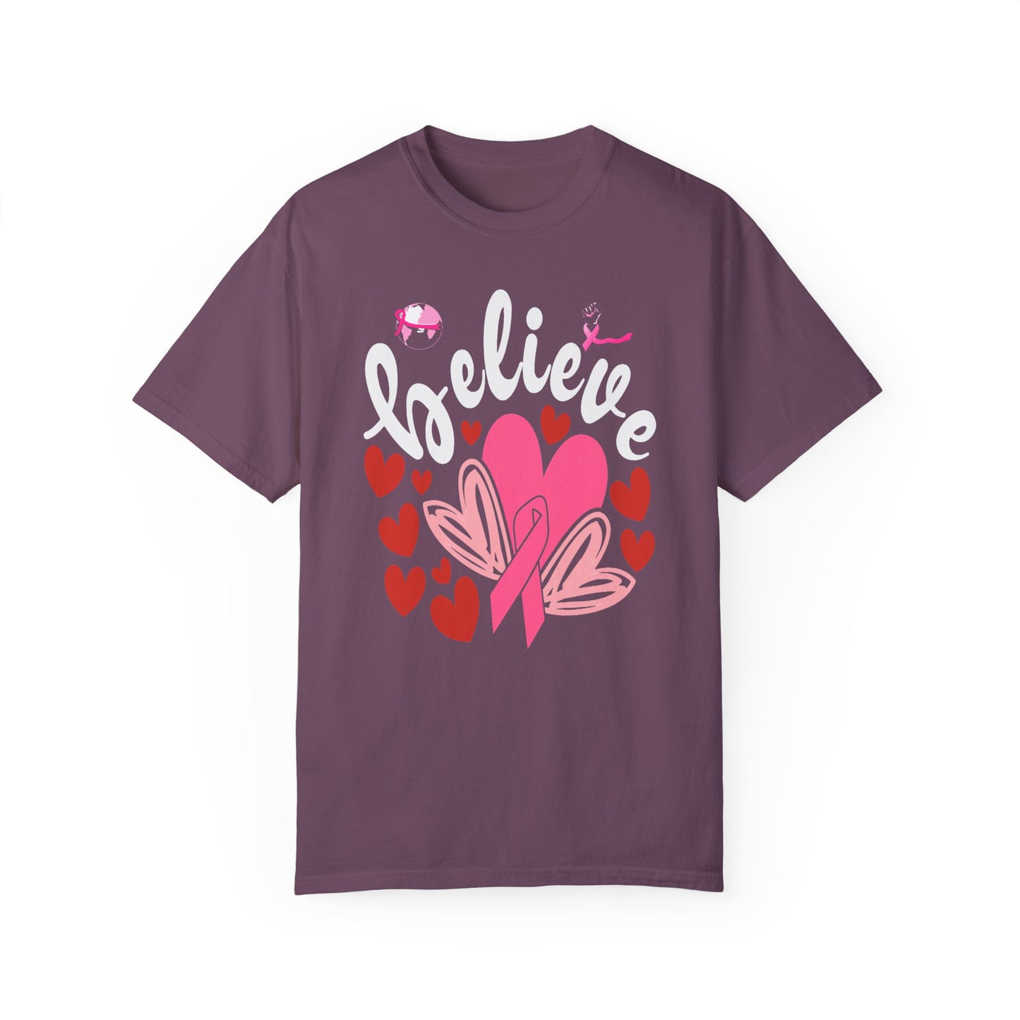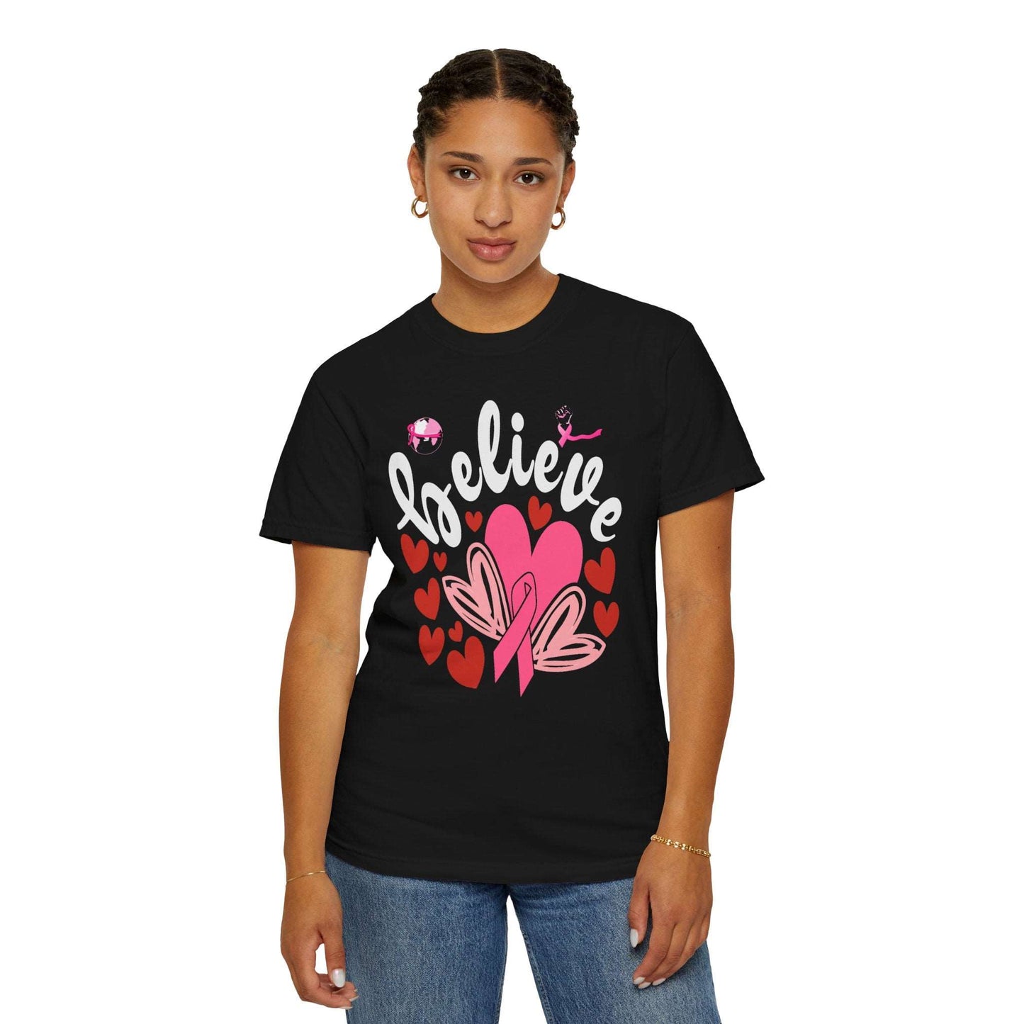 Embrace hope and love with our “Believe in Love” t-shirt, thoughtfully designed to inspire strength and solidarity. This eye-catching tee features the empowering word “Believe” in elegant cursive script, interwoven with a symbolic pink ribbon at its heart. Adorned with an array of hearts in varying sizes, this design signifies unwavering support for breast cancer warriors and survivors. Crafted from soft, breathable fabric, it’s not just a statement piece but also a comfortable everyday choice. Join us in spreading awareness and positivity with every wear.