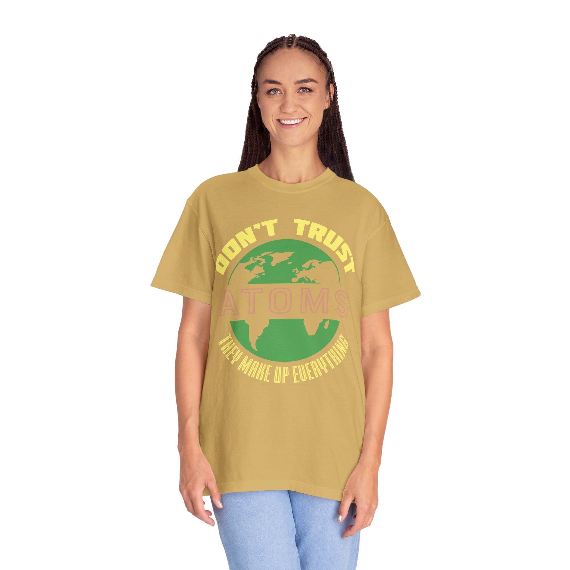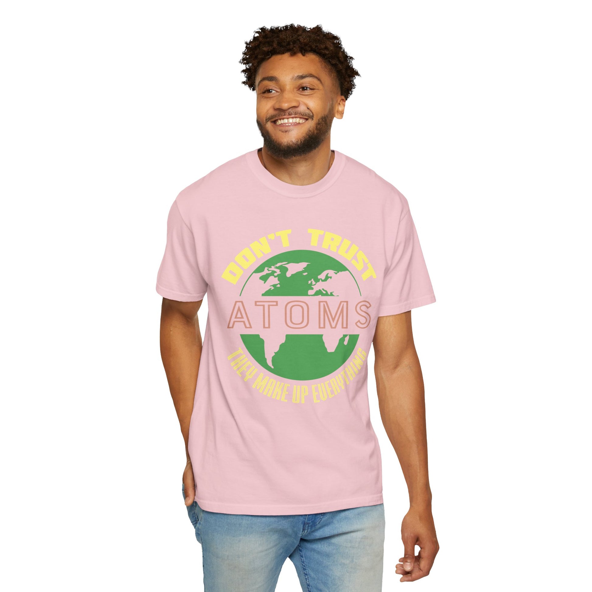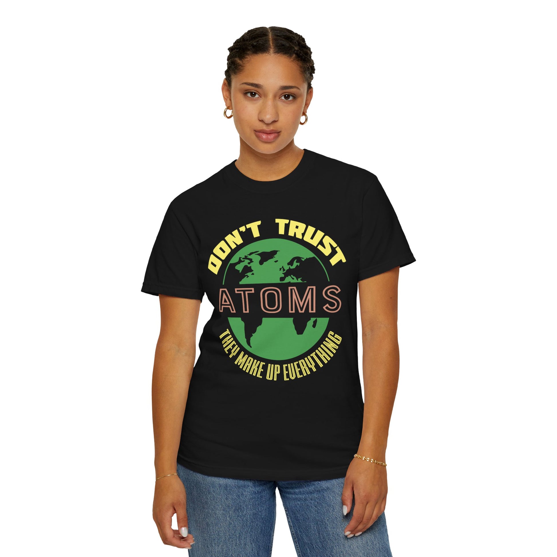 Add a touch of humor to your wardrobe with our “Don’t Trust Atoms - They Make Up Everything” t-shirt. This design features a clever science pun that’s sure to bring a smile to anyone who sees it. The bold, gradient text stands out against the black background, making this shirt a standout piece in any outfit. Whether you’re a science enthusiast or just love a good joke, this shirt is a fun and stylish choice.