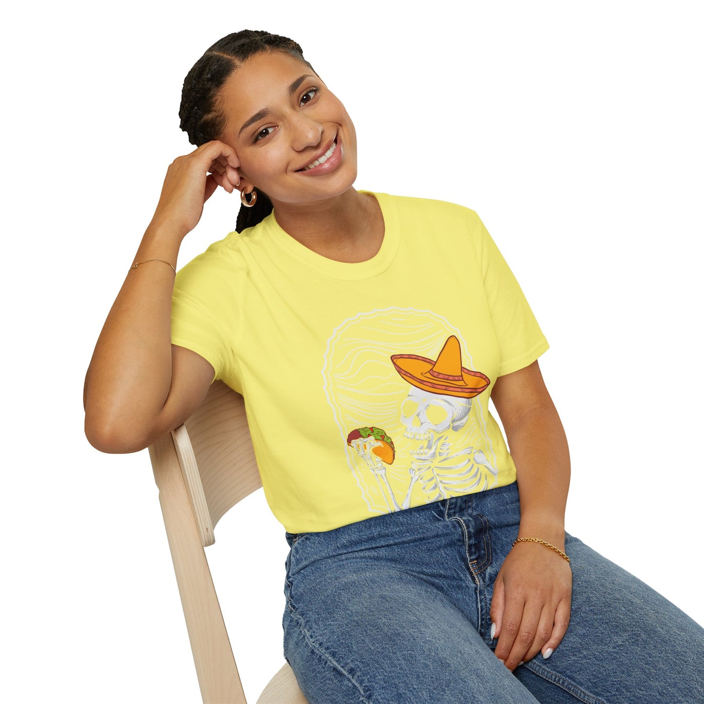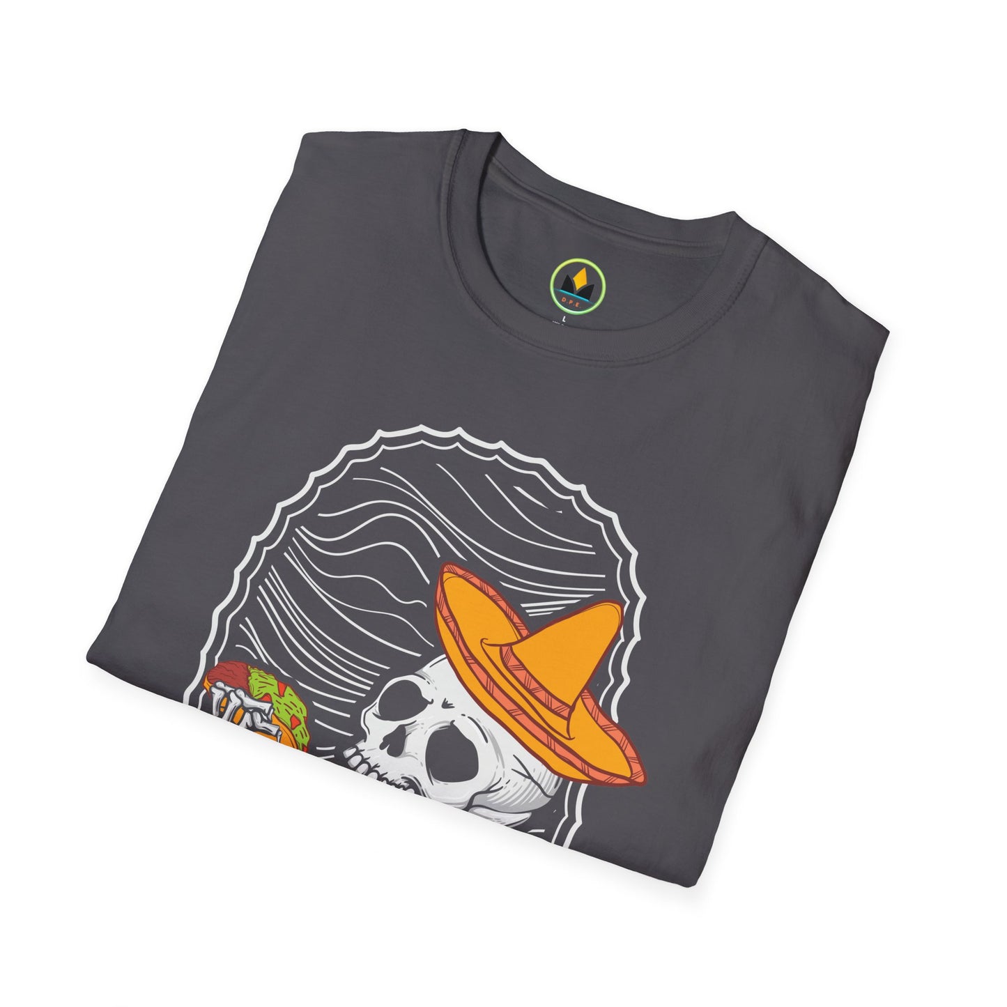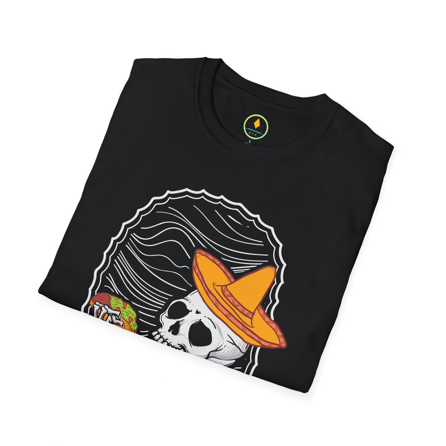 Get ready to spice up your Halloween wardrobe with our “Fiesta of Frights” T-shirt! This unique piece features an eye-catching graphic of a jovial skeleton donning a vibrant sombrero, poised to take a bite out of a deliciously detailed taco. Crafted for those who love to blend humor with horror, this shirt is perfect for Halloween parties or any festive occasion that calls for an extra dash of fun.