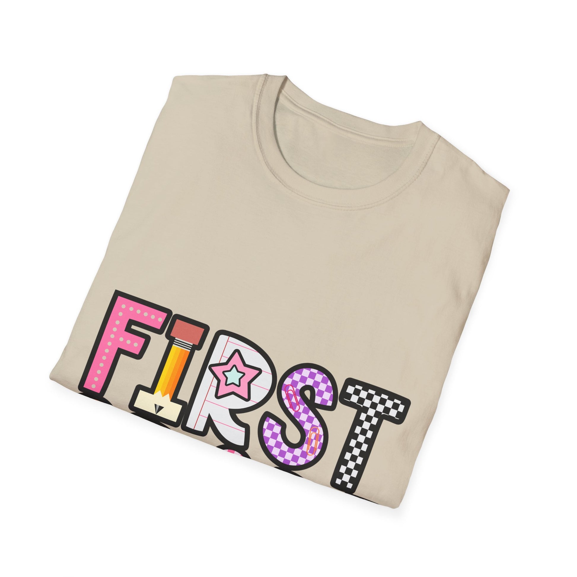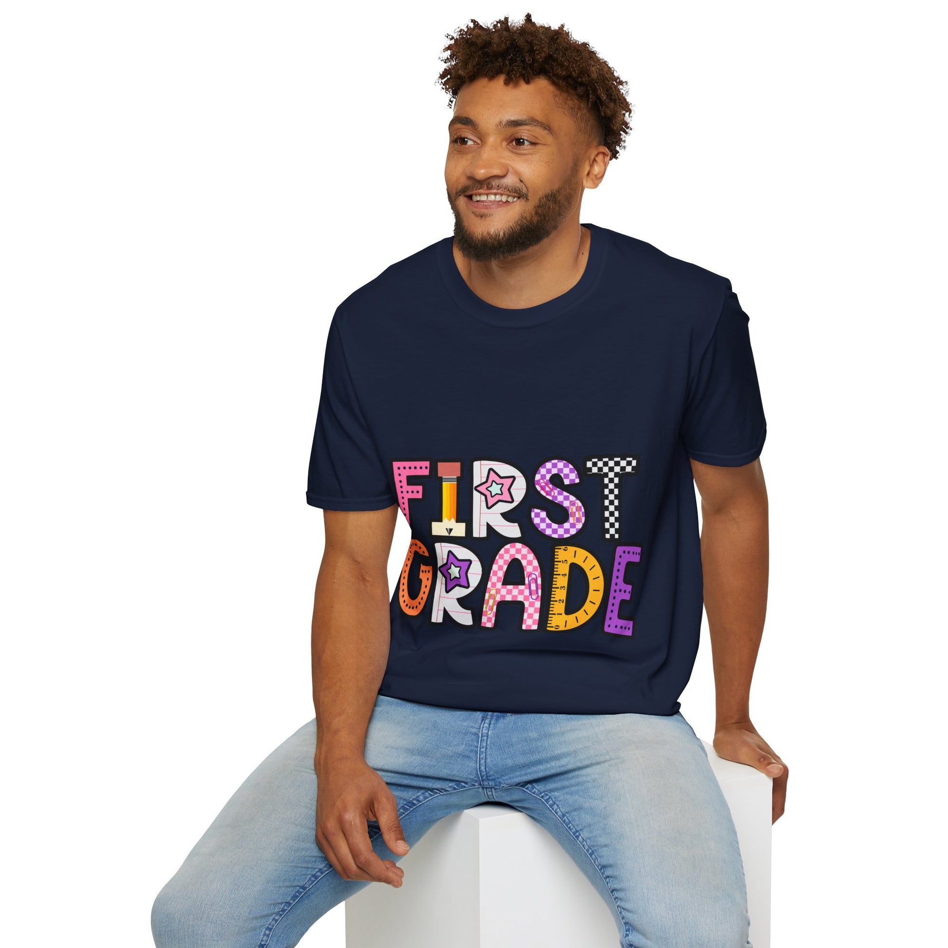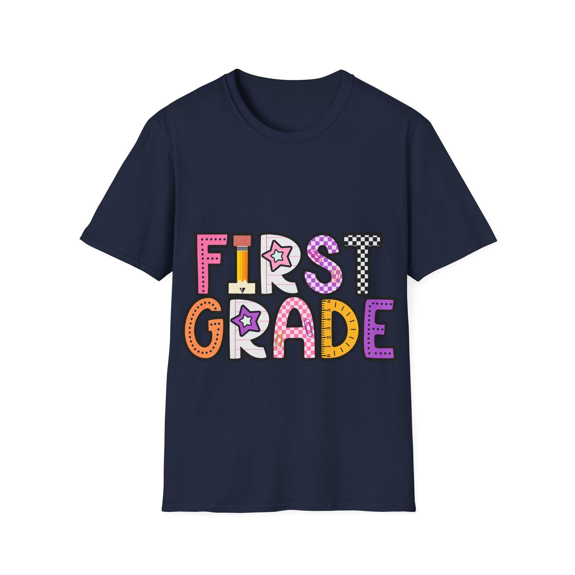 Step into the classroom with energy and retro charm! This soft, lightweight tee features the words "FIRST GRADE" in bold, playful bubble letters filled with vibrant patterns like checkered prints, lightning bolts, and stars. The mix of bright pinks, purples, and oranges pops beautifully against the black fabric, creating a fun, nostalgic vibe perfect for the first day of school, open houses, or matching "Team First Grade" days.