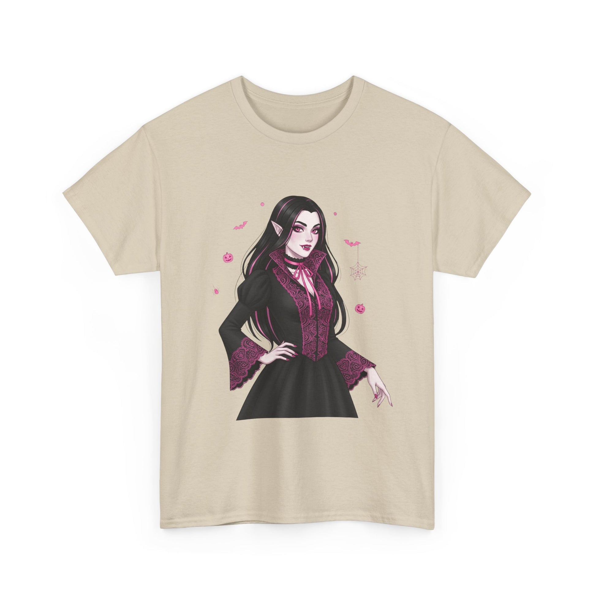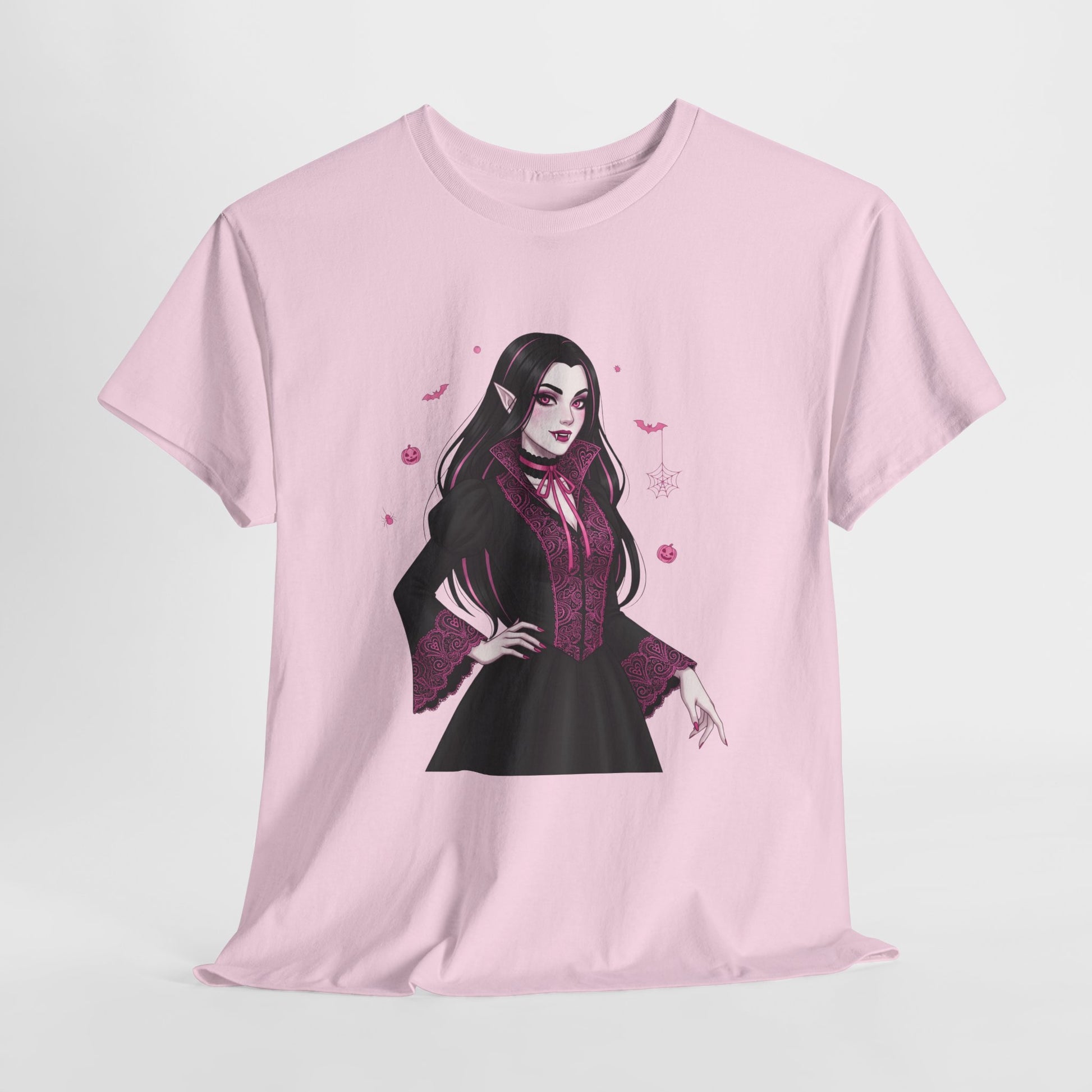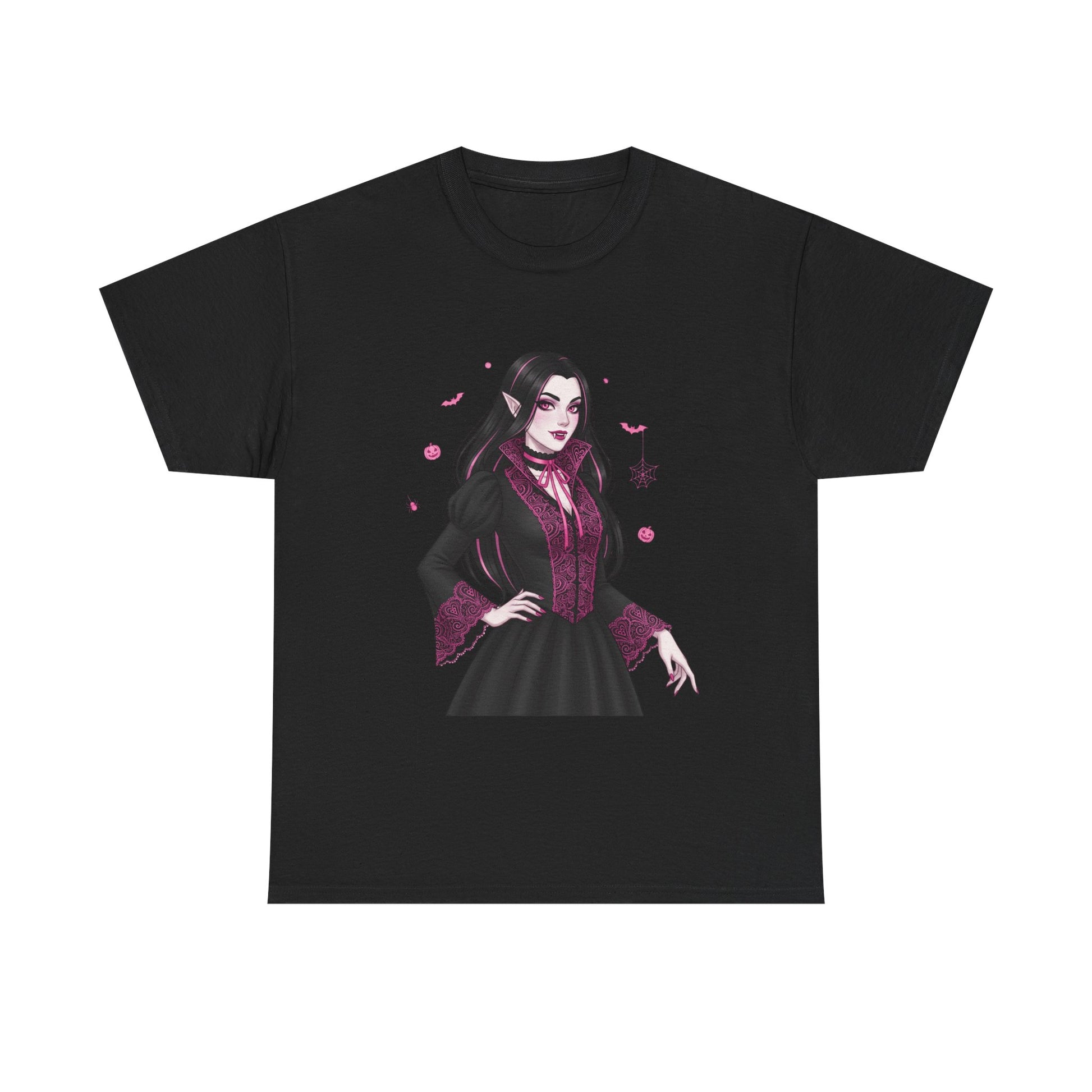 Embrace the elegant darkness of October with a champion of the night. This stunning design features a gothic vampiress, surrounded by spooky Halloween icons like bats, spiders, and pumpkins.