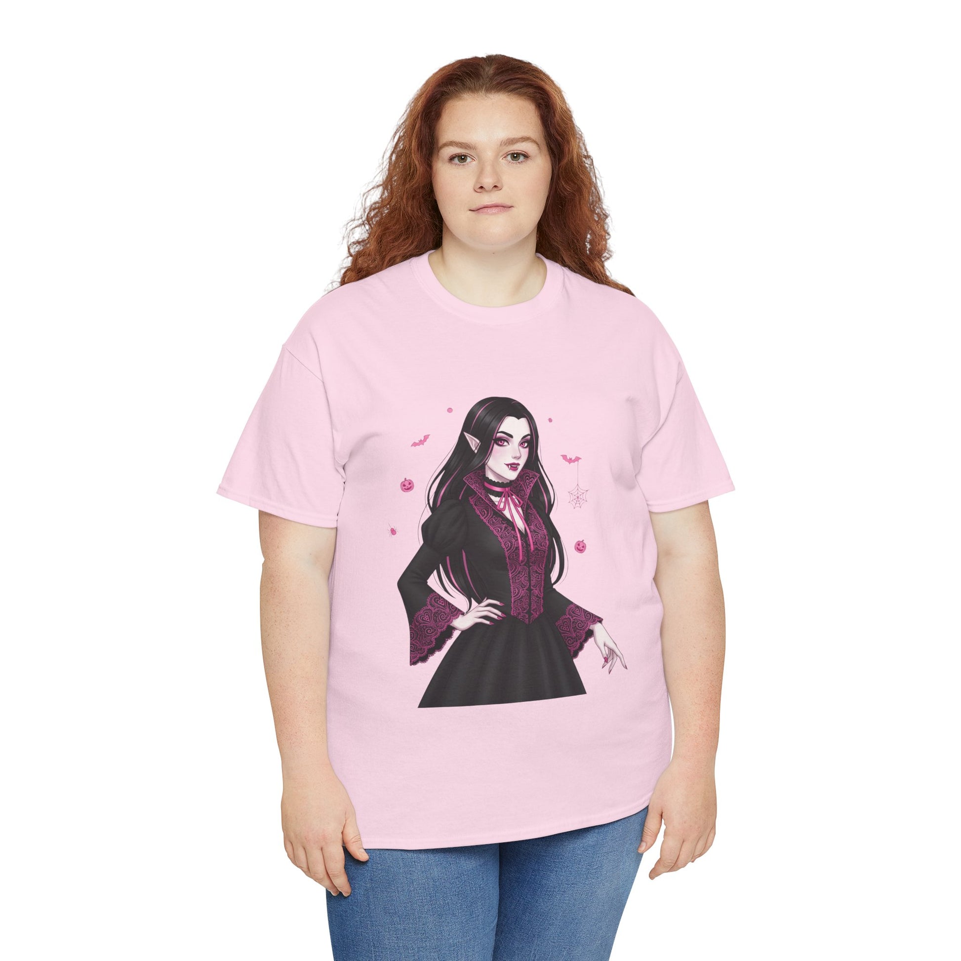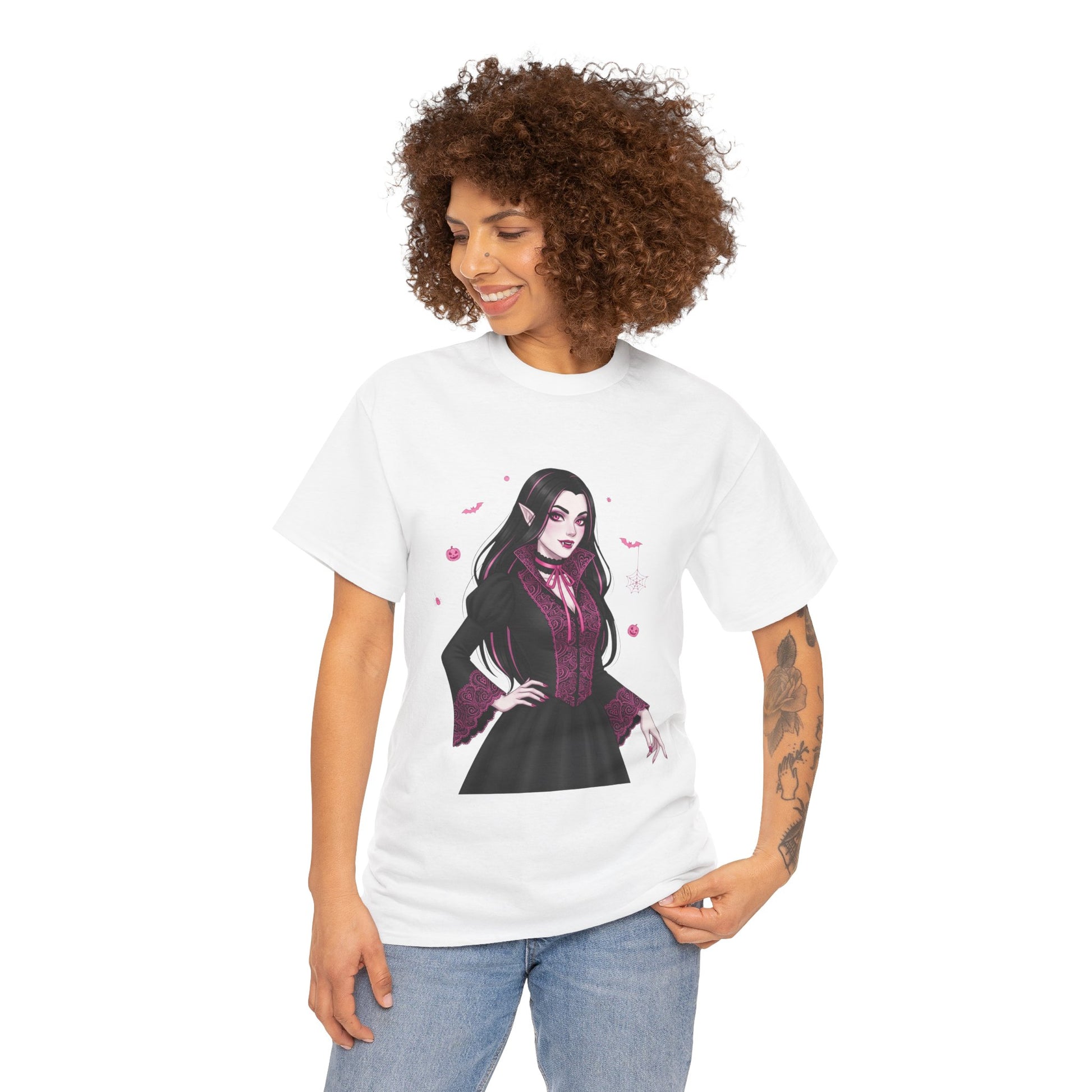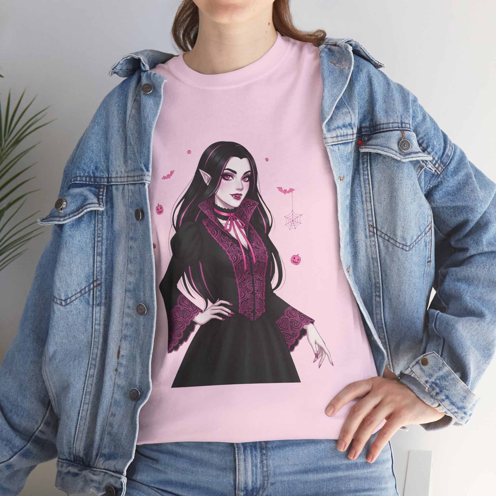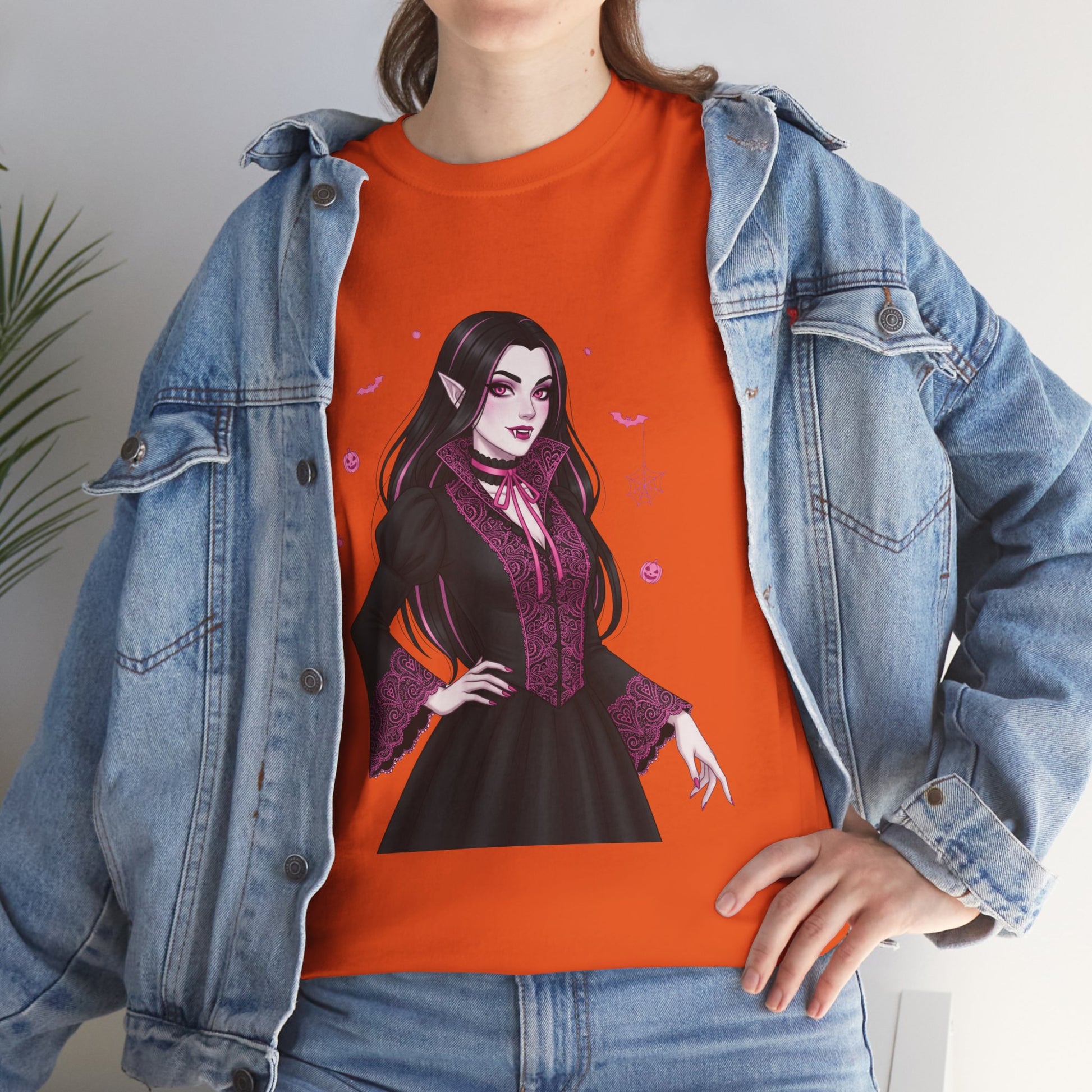 Embrace the elegant darkness of October with a champion of the night. This stunning design features a gothic vampiress, surrounded by spooky Halloween icons like bats, spiders, and pumpkins.