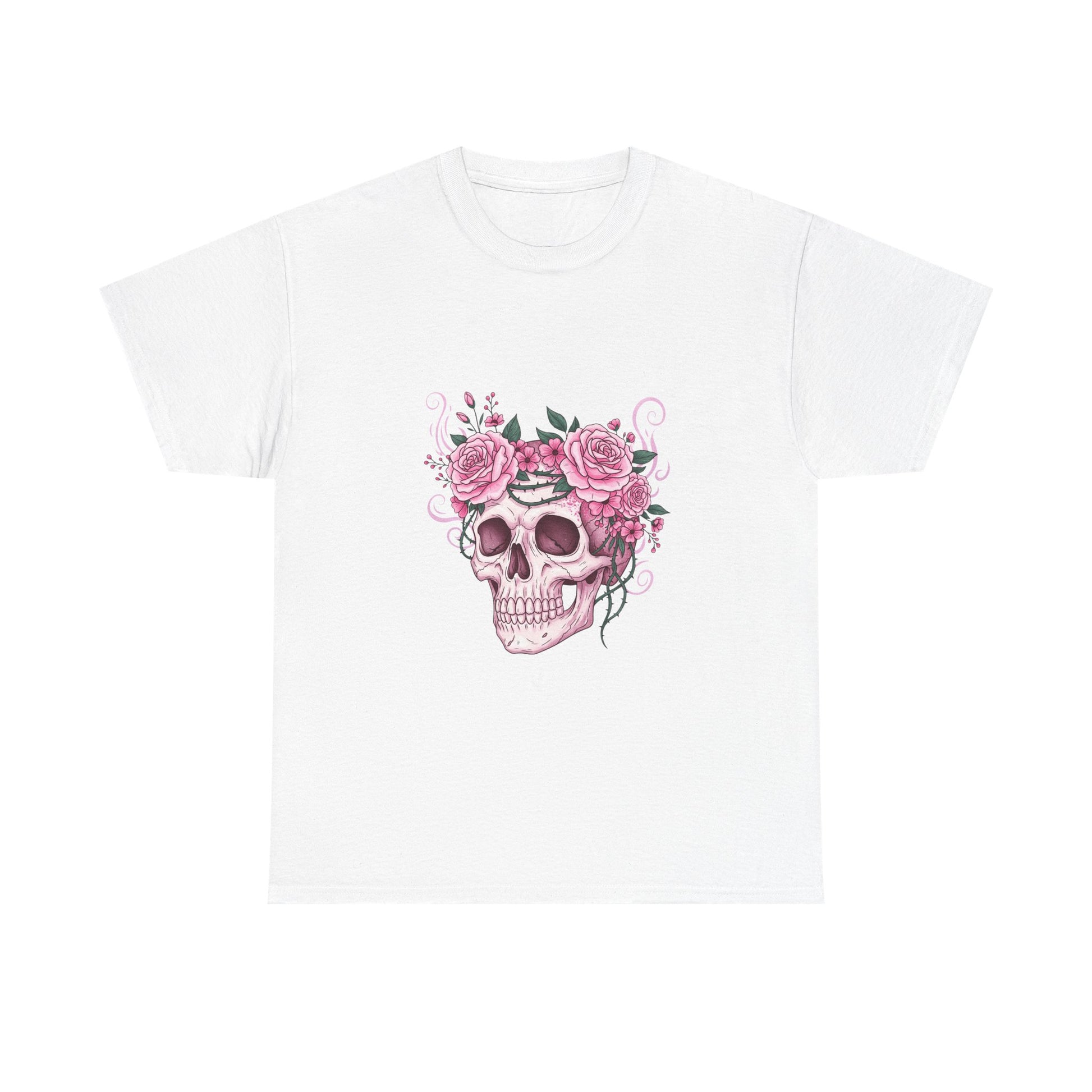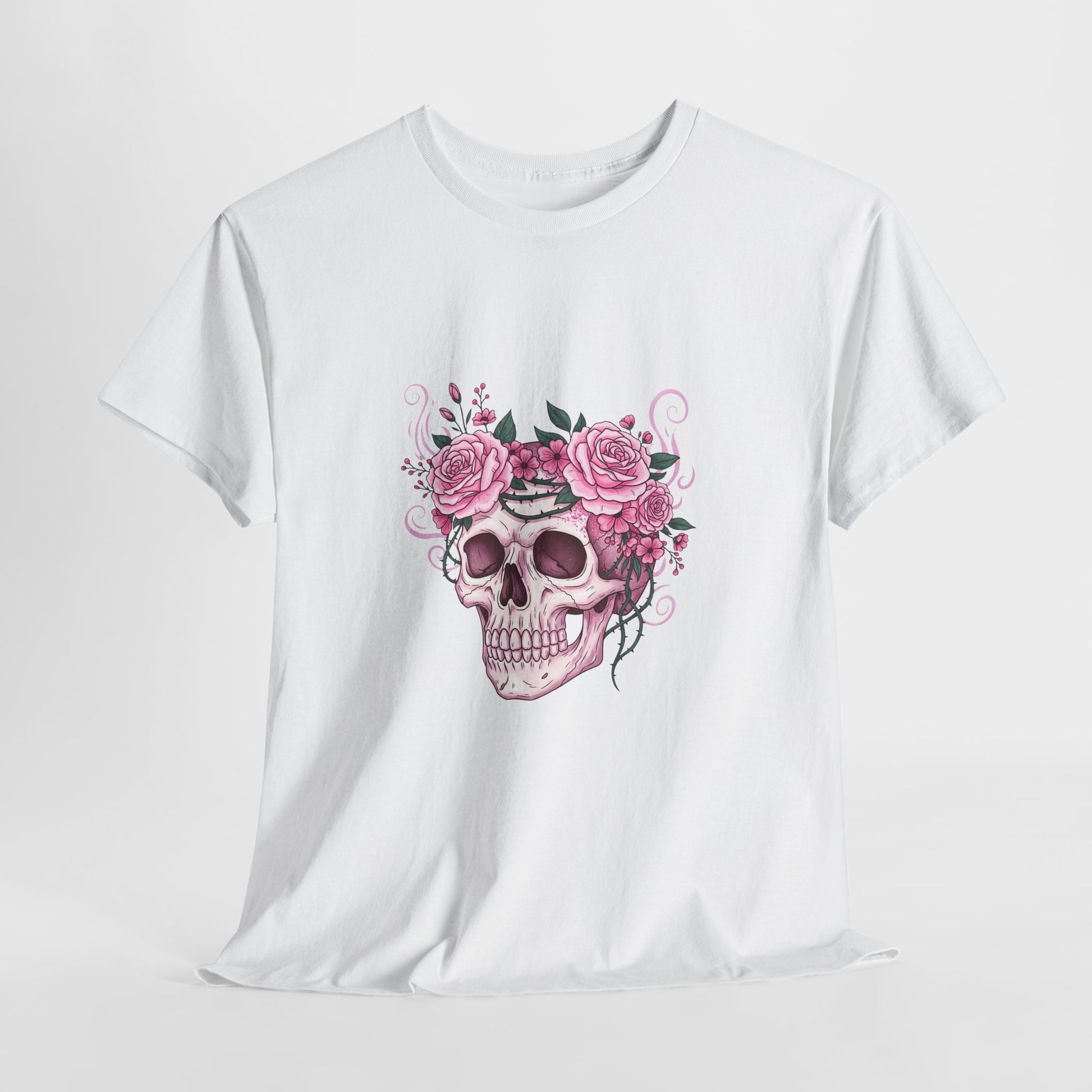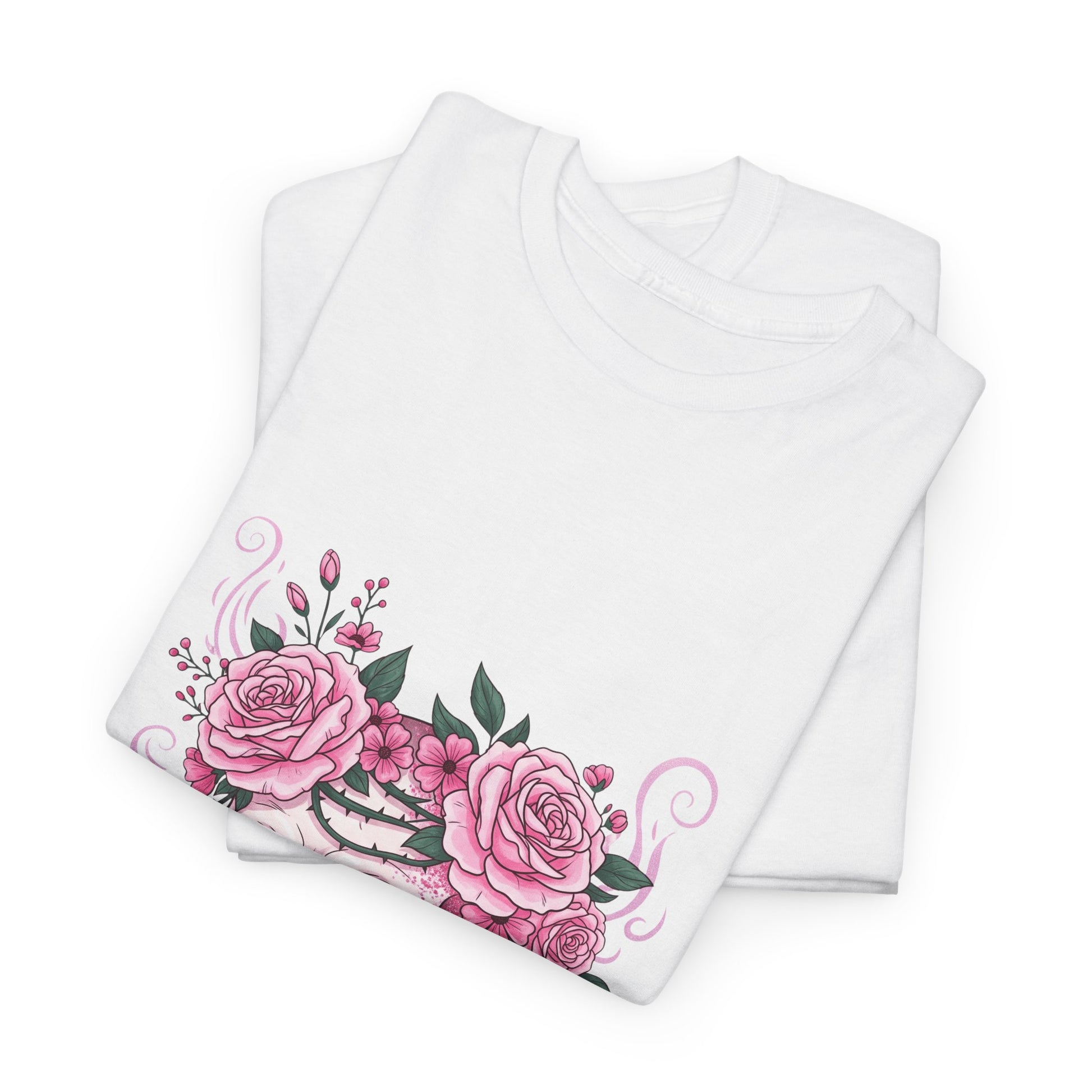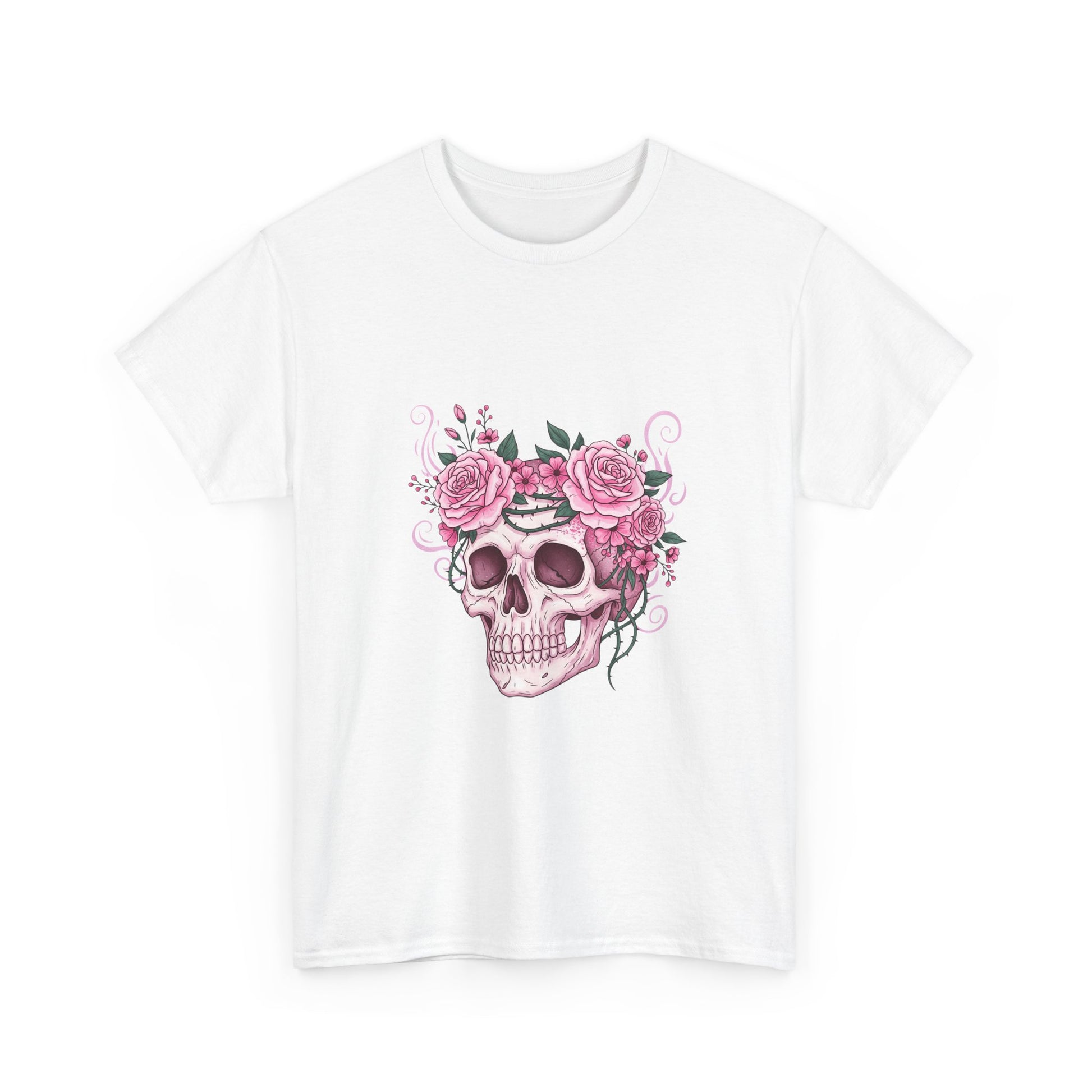This October, beauty blooms in the face of horror. This stunning design features a classic symbol of Halloween—a human skull—adorned with a defiant crown of blooming pink roses and thorny vines.
