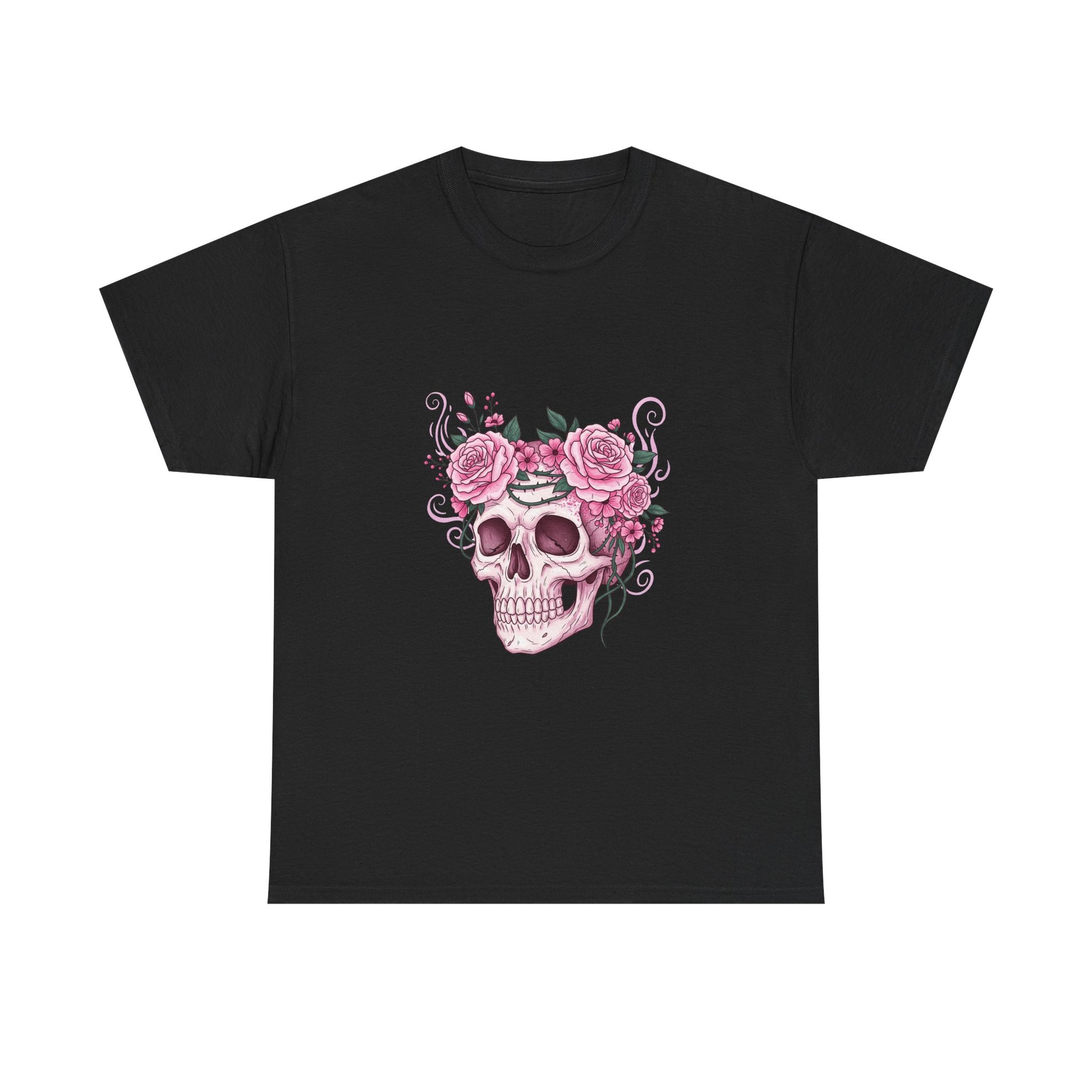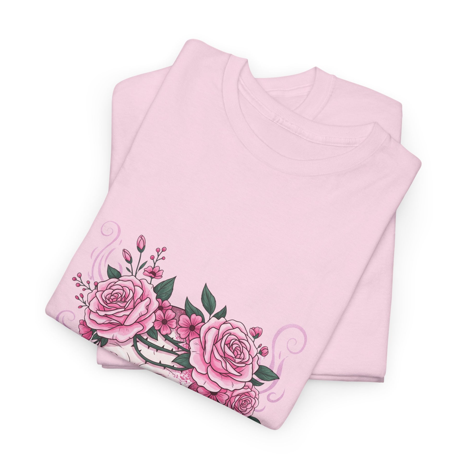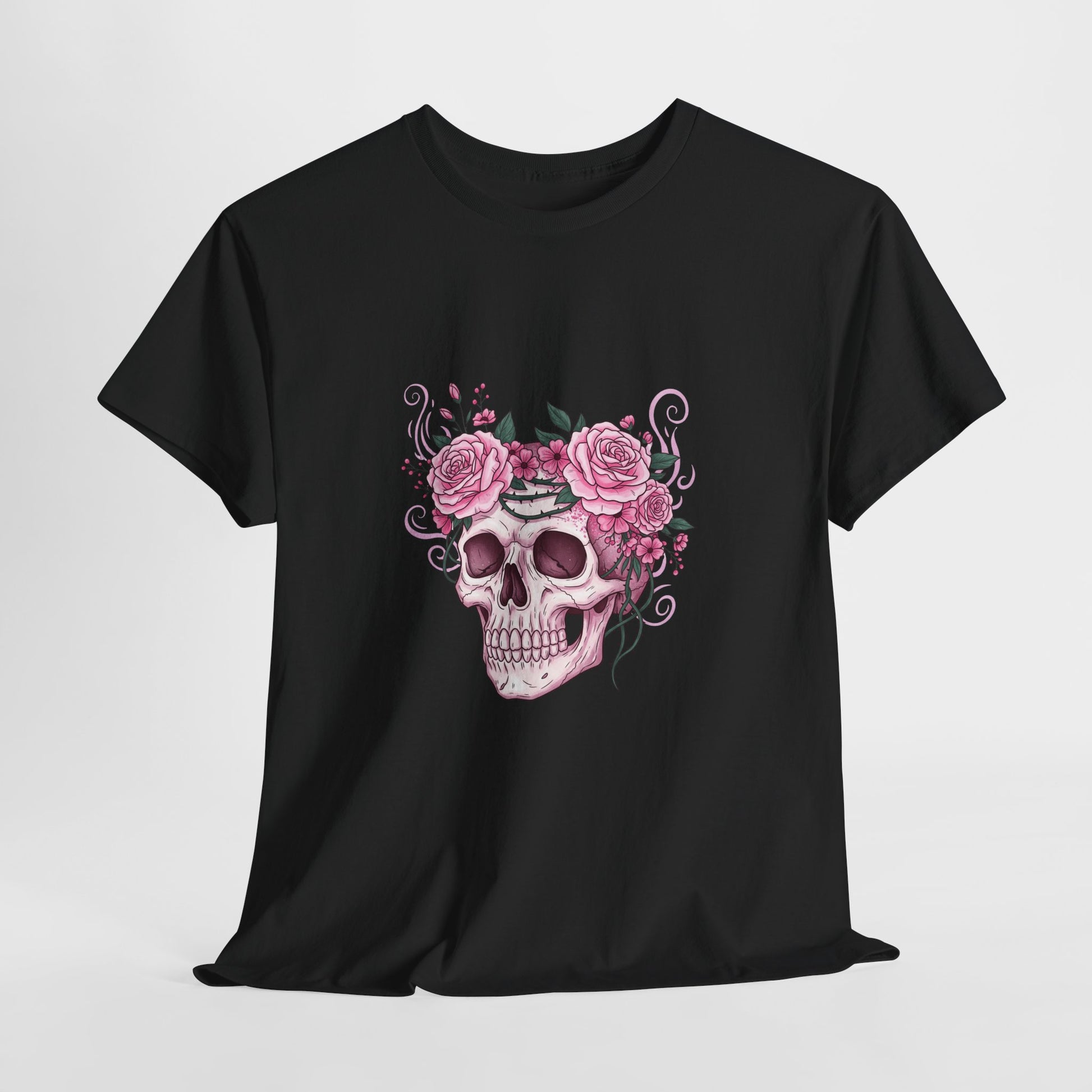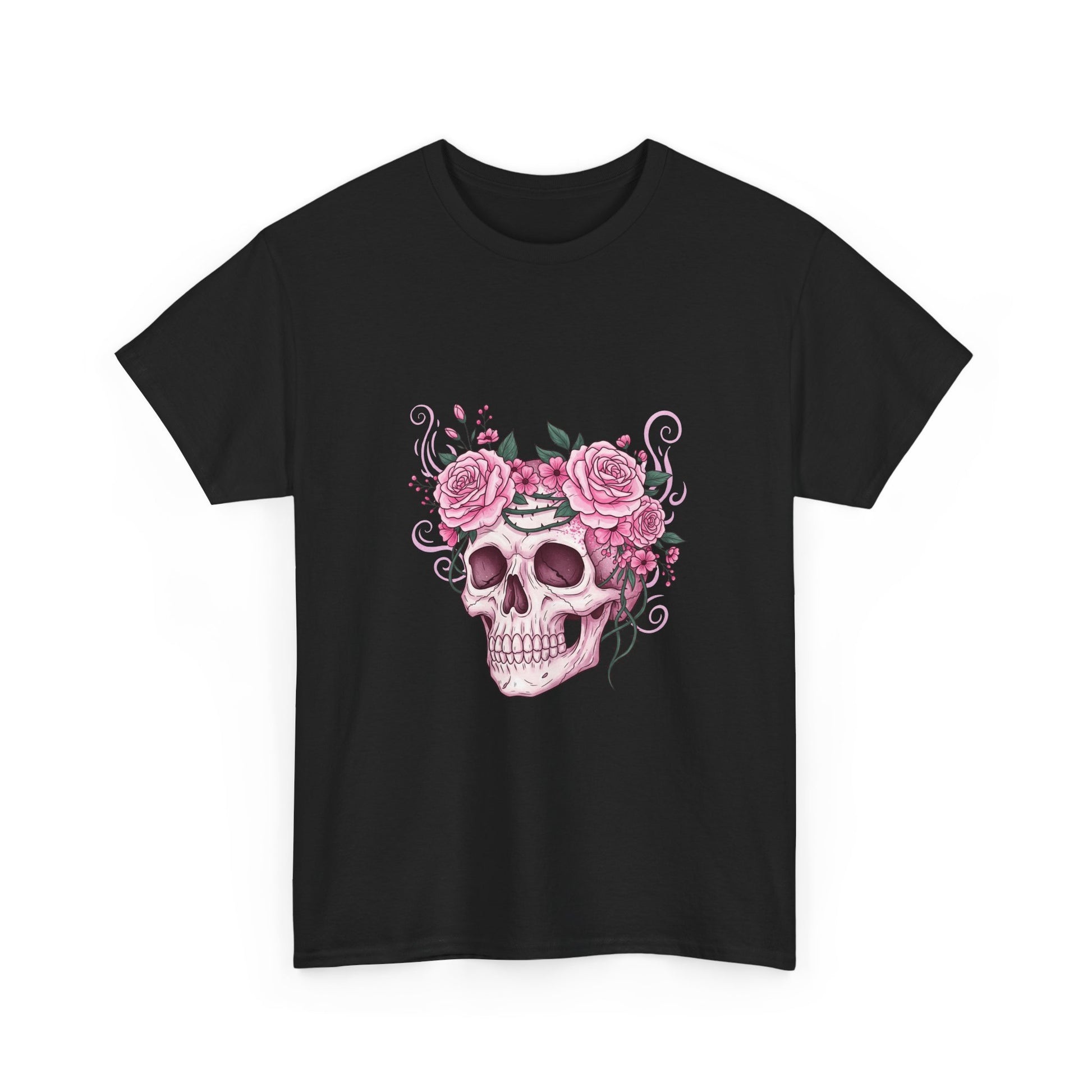 This October, beauty blooms in the face of horror. This stunning design features a classic symbol of Halloween—a human skull—adorned with a defiant crown of blooming pink roses and thorny vines.