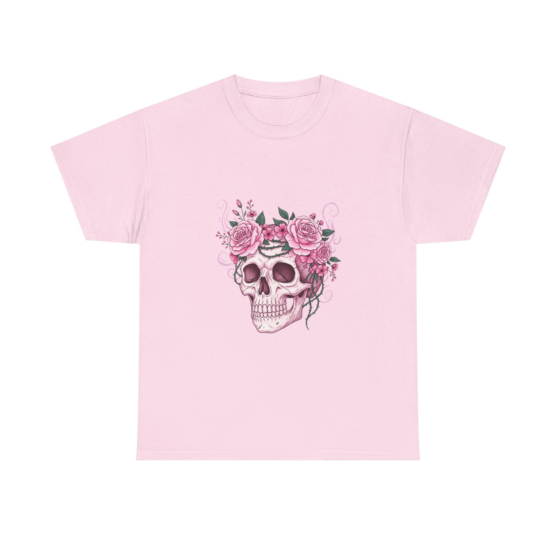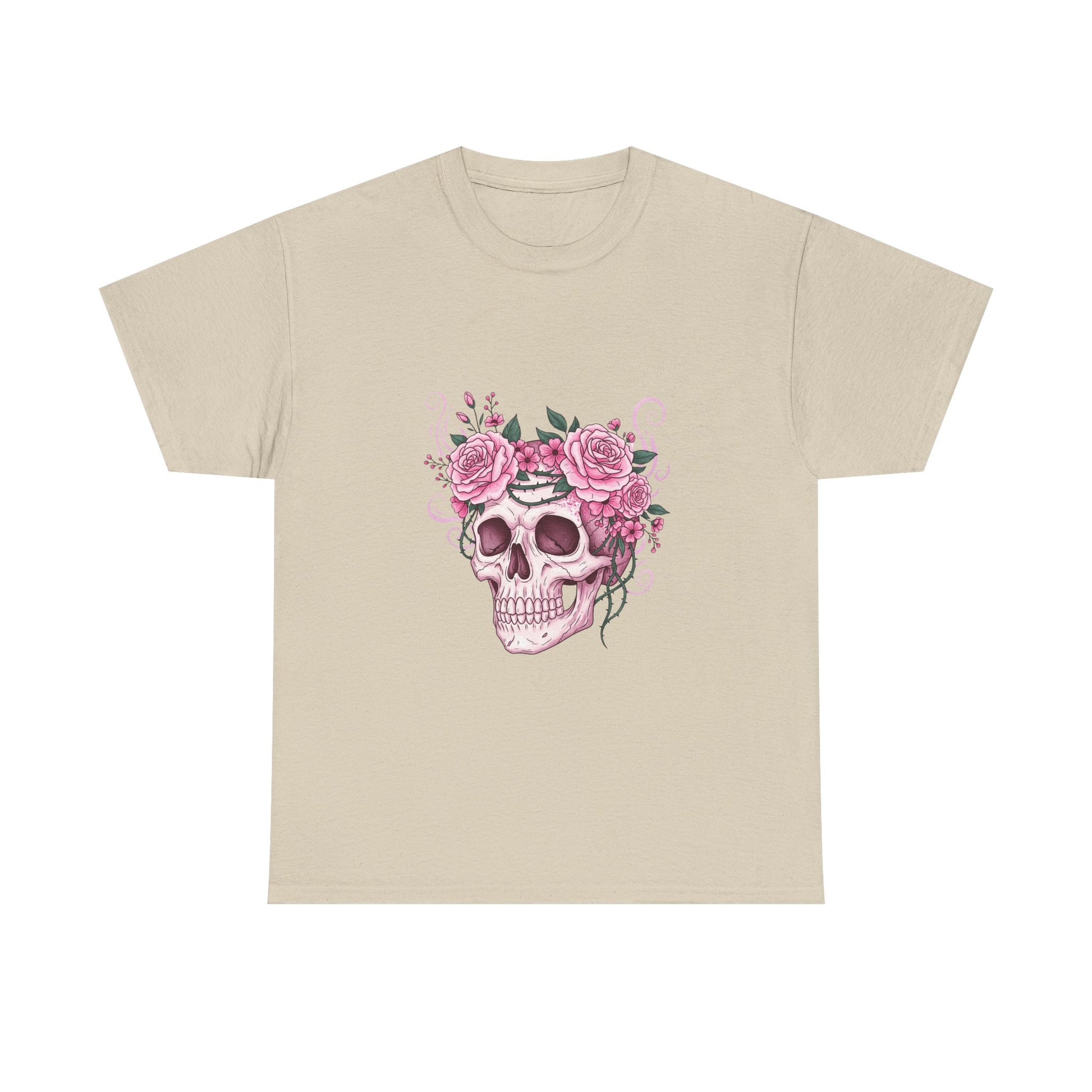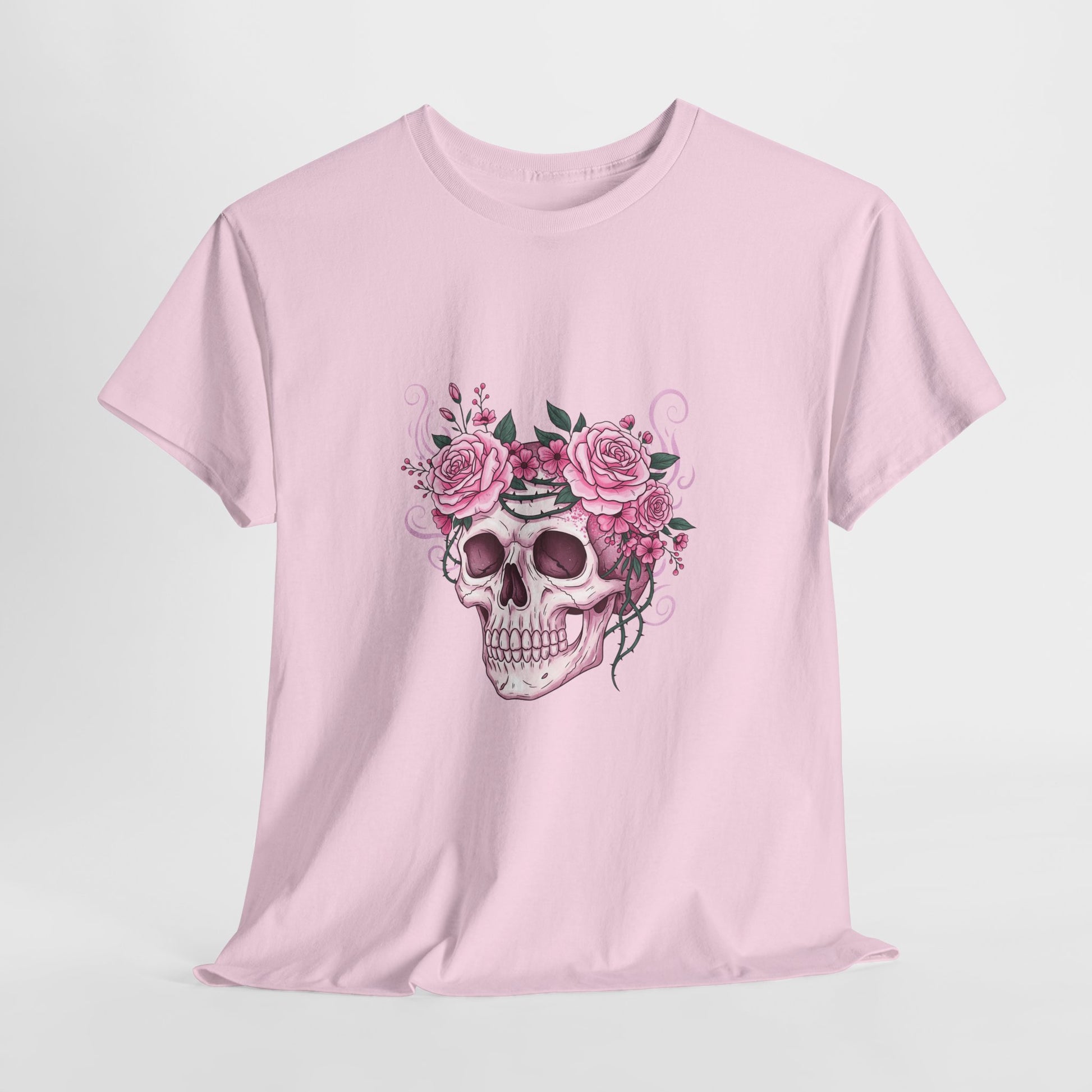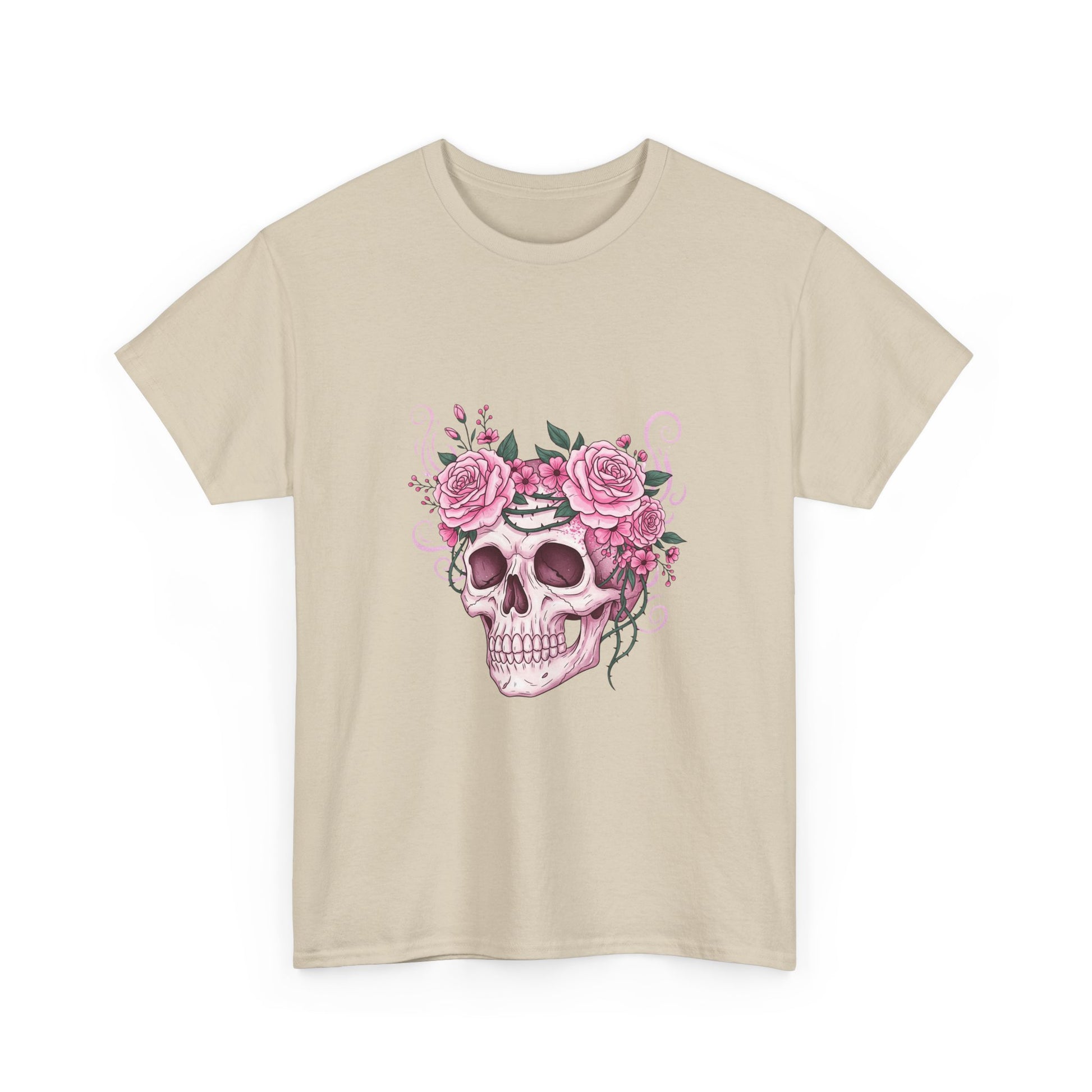 This October, beauty blooms in the face of horror. This stunning design features a classic symbol of Halloween—a human skull—adorned with a defiant crown of blooming pink roses and thorny vines.