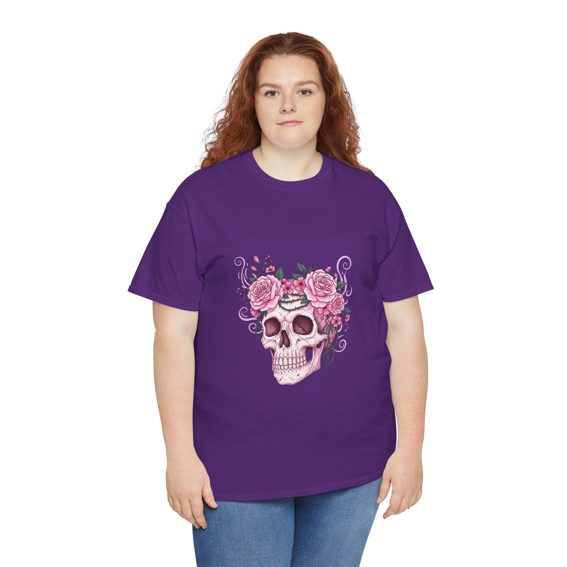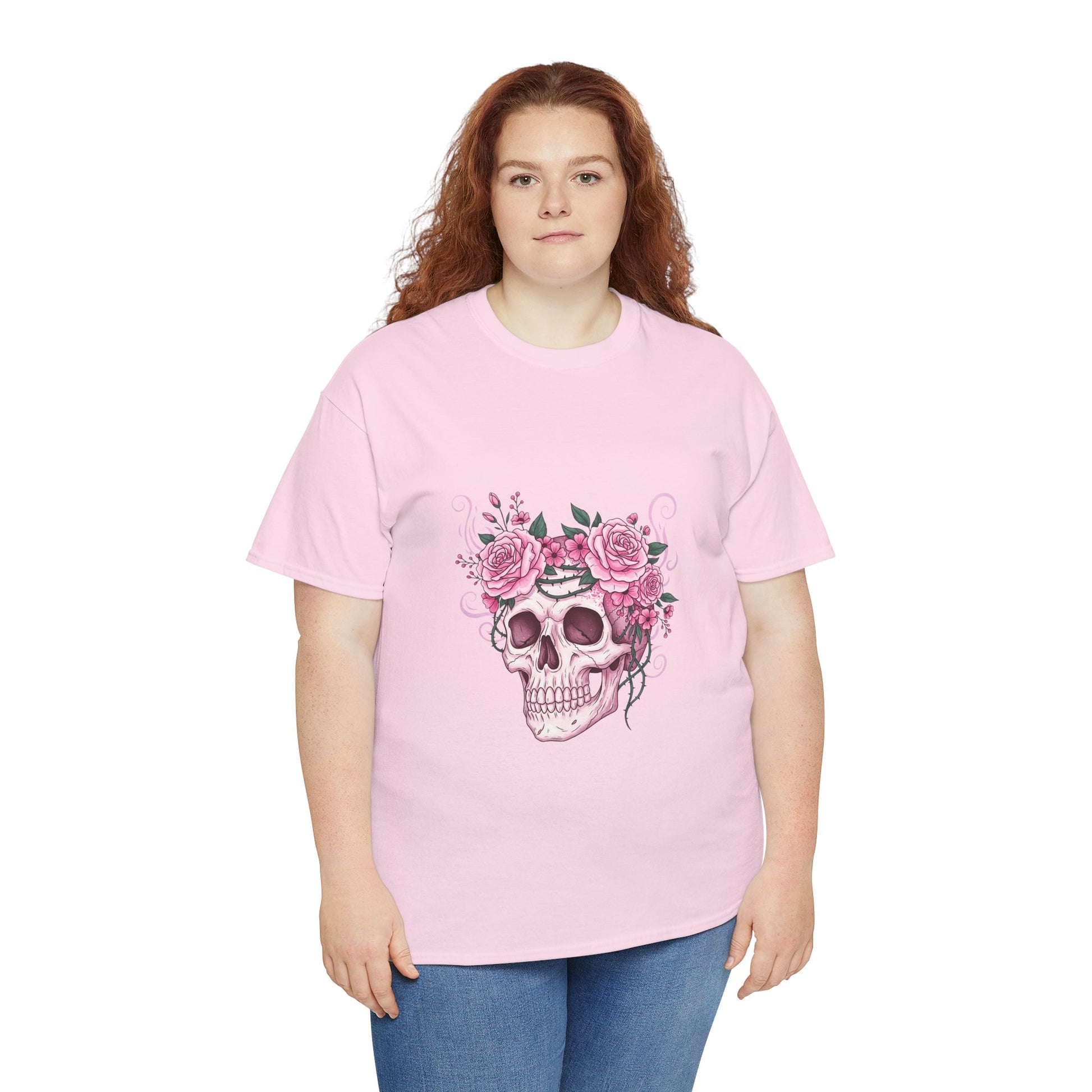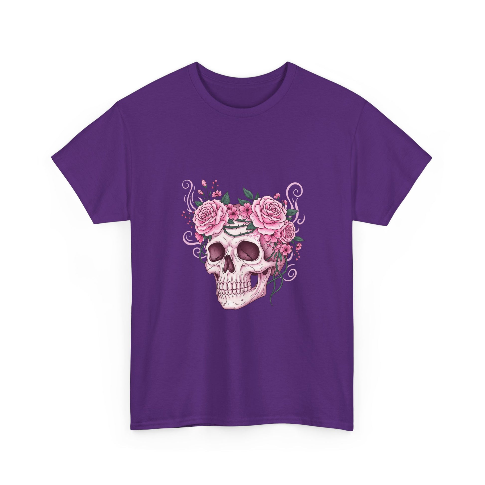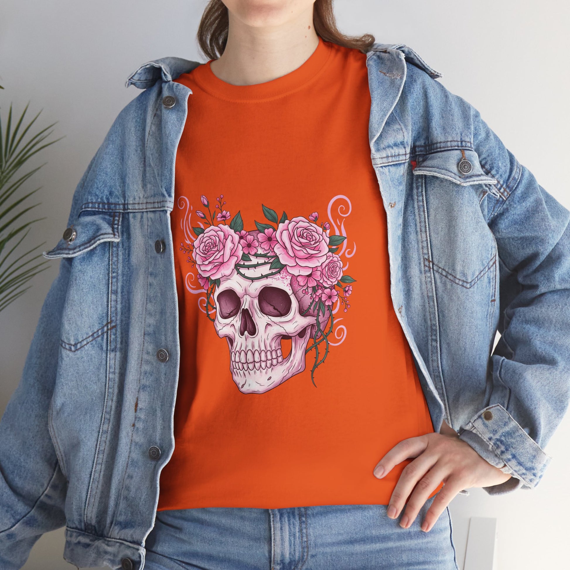 This October, beauty blooms in the face of horror. This stunning design features a classic symbol of Halloween—a human skull—adorned with a defiant crown of blooming pink roses and thorny vines.