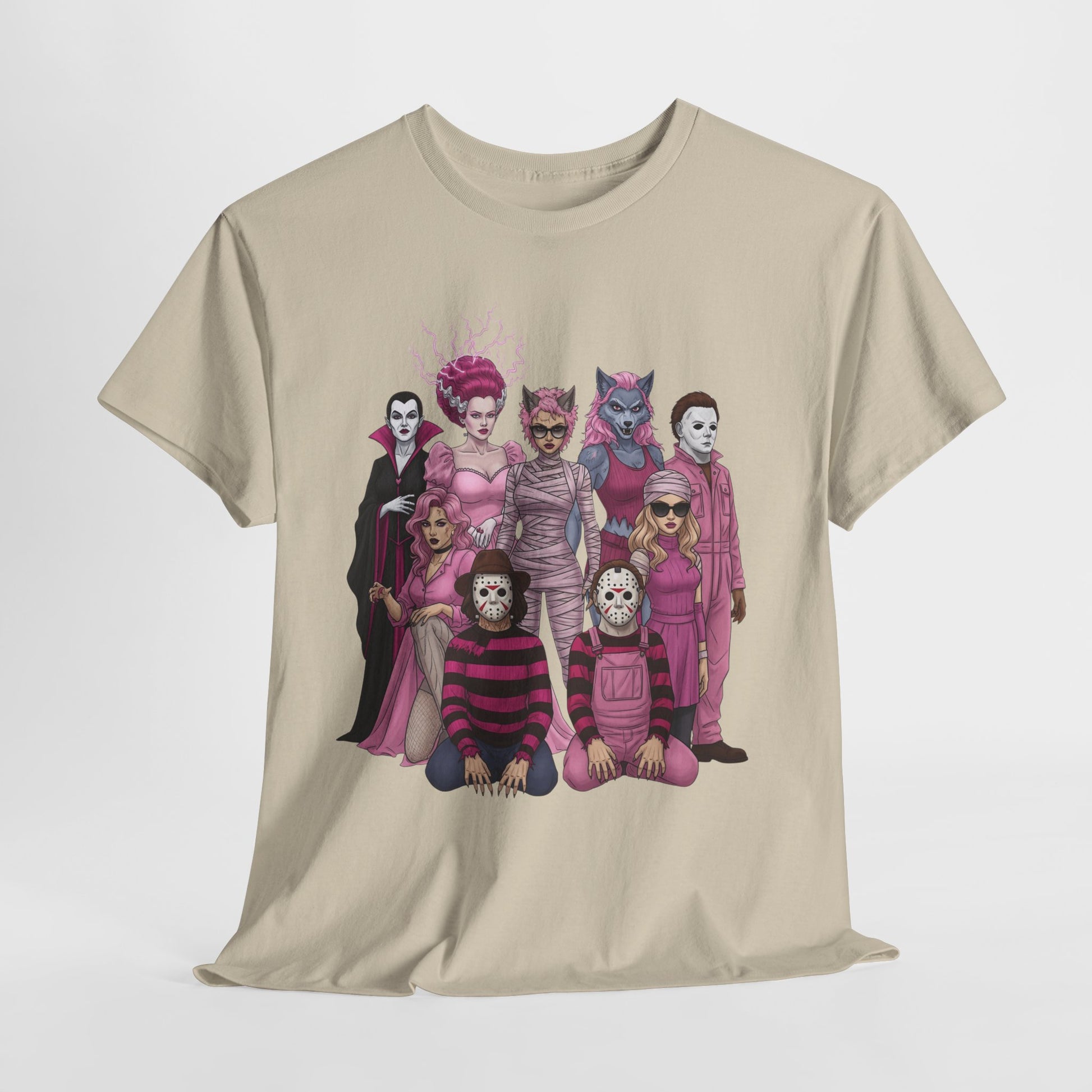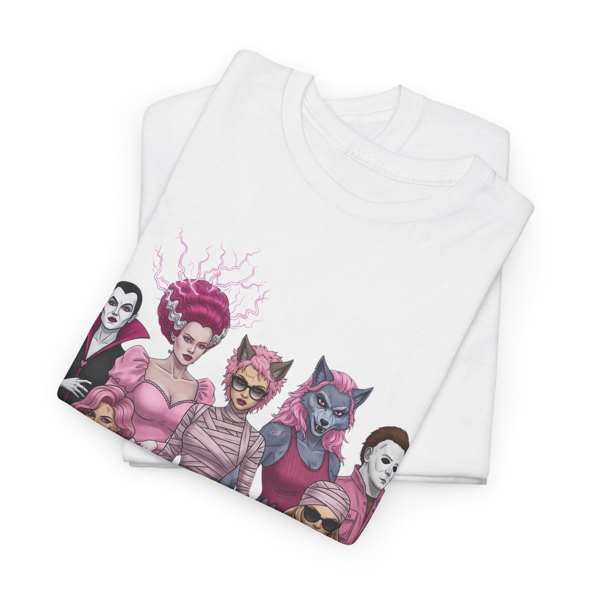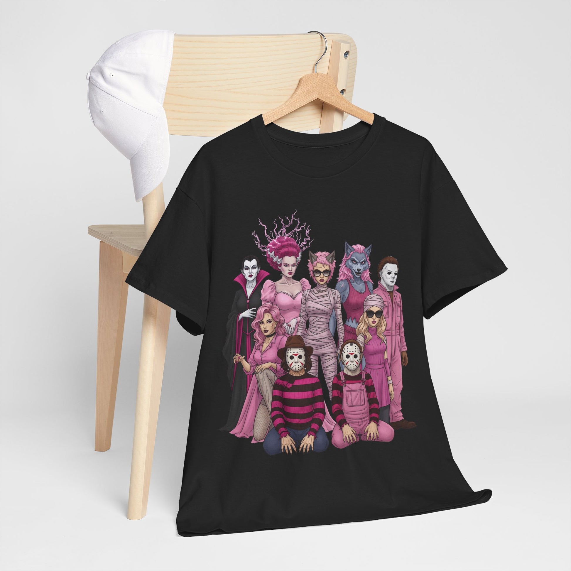 This design is drenched in shades of pink for a very important reason. October is not only the month of Halloween, but also Breast Cancer Awareness Month. The vibrant pink palette is our tribute to the fierce spirit of the fighters, survivors, and loved ones in that battle. Each shirt stands as a symbol of solidarity, weaving together the fantasy of horror with the real-world strength and resilience of women everywhere.
