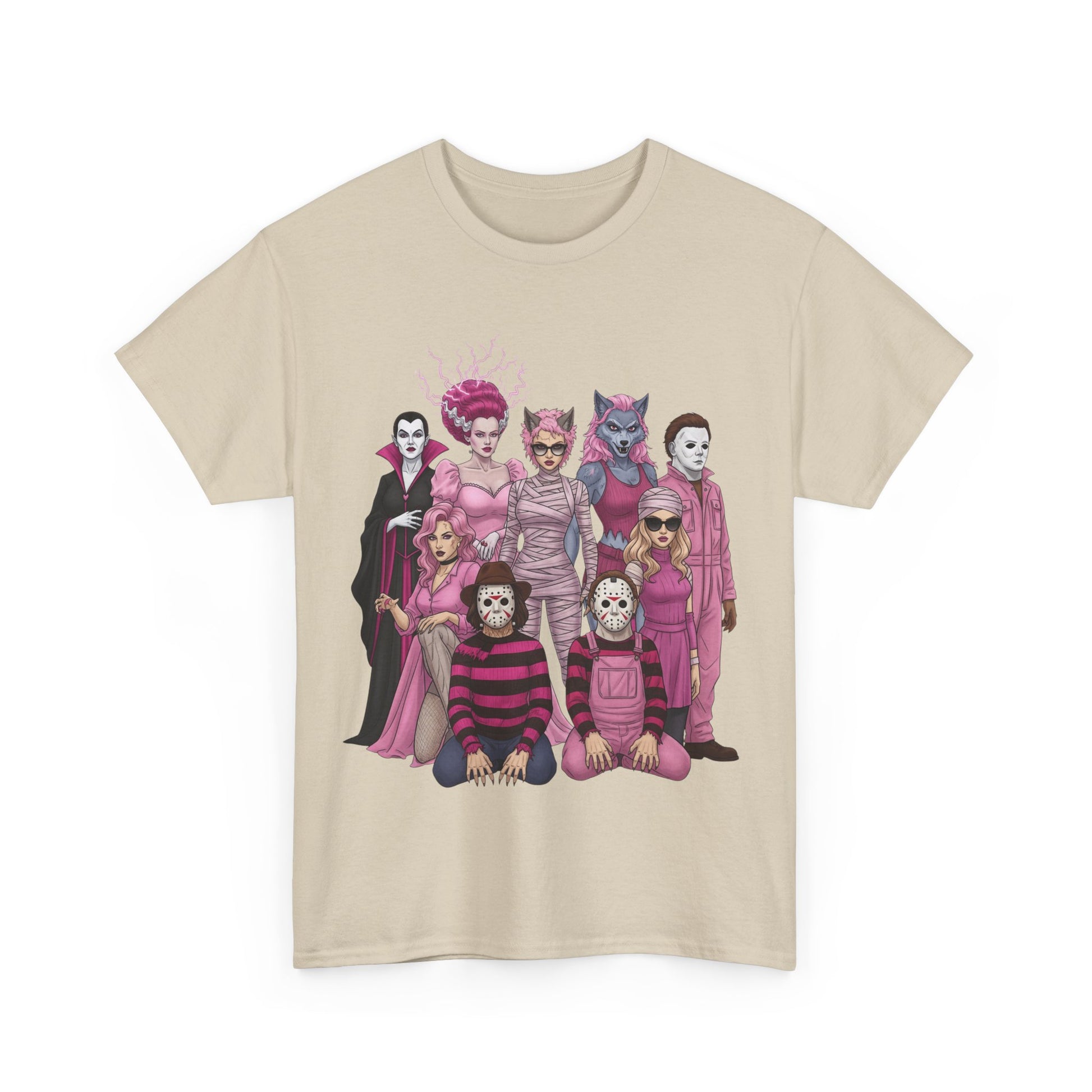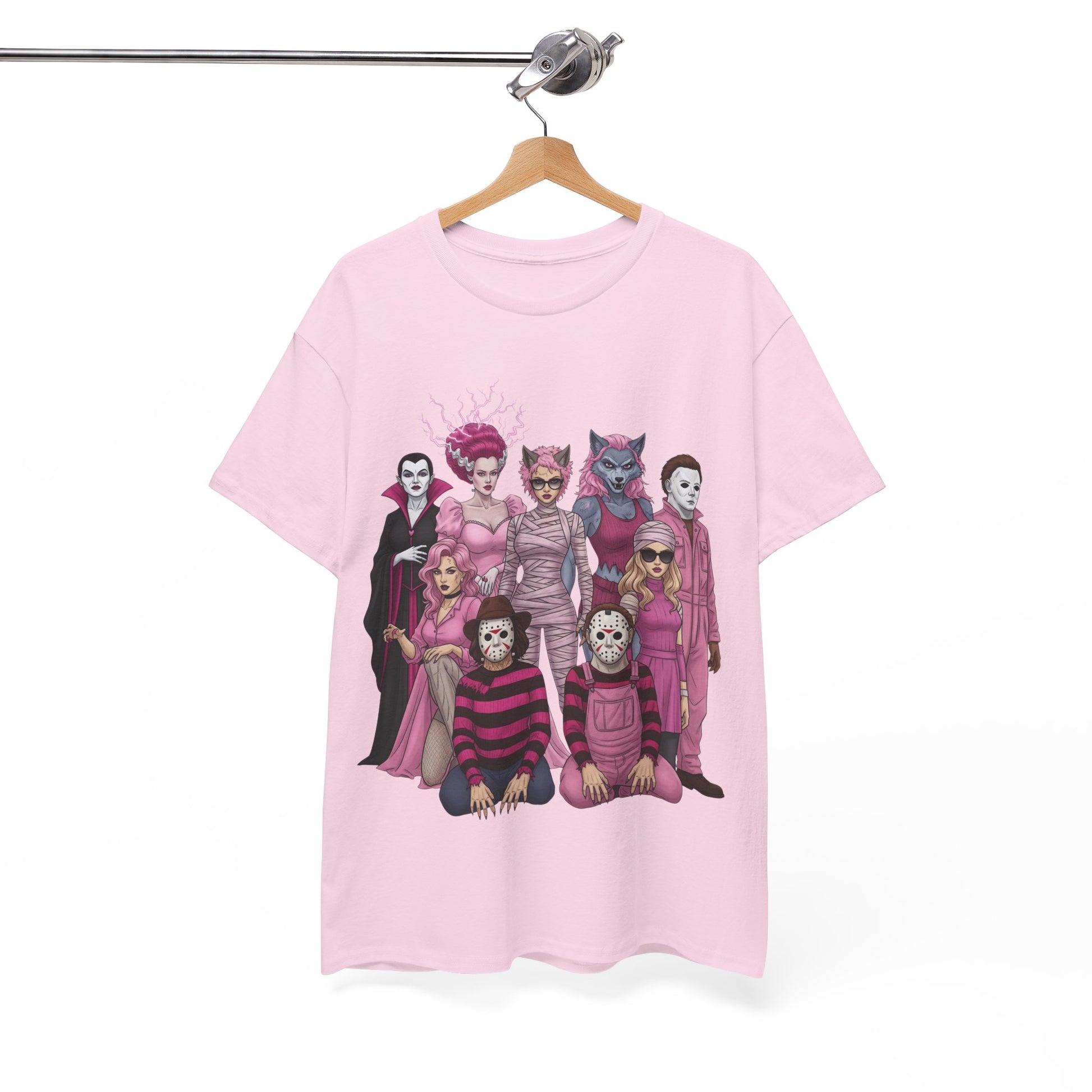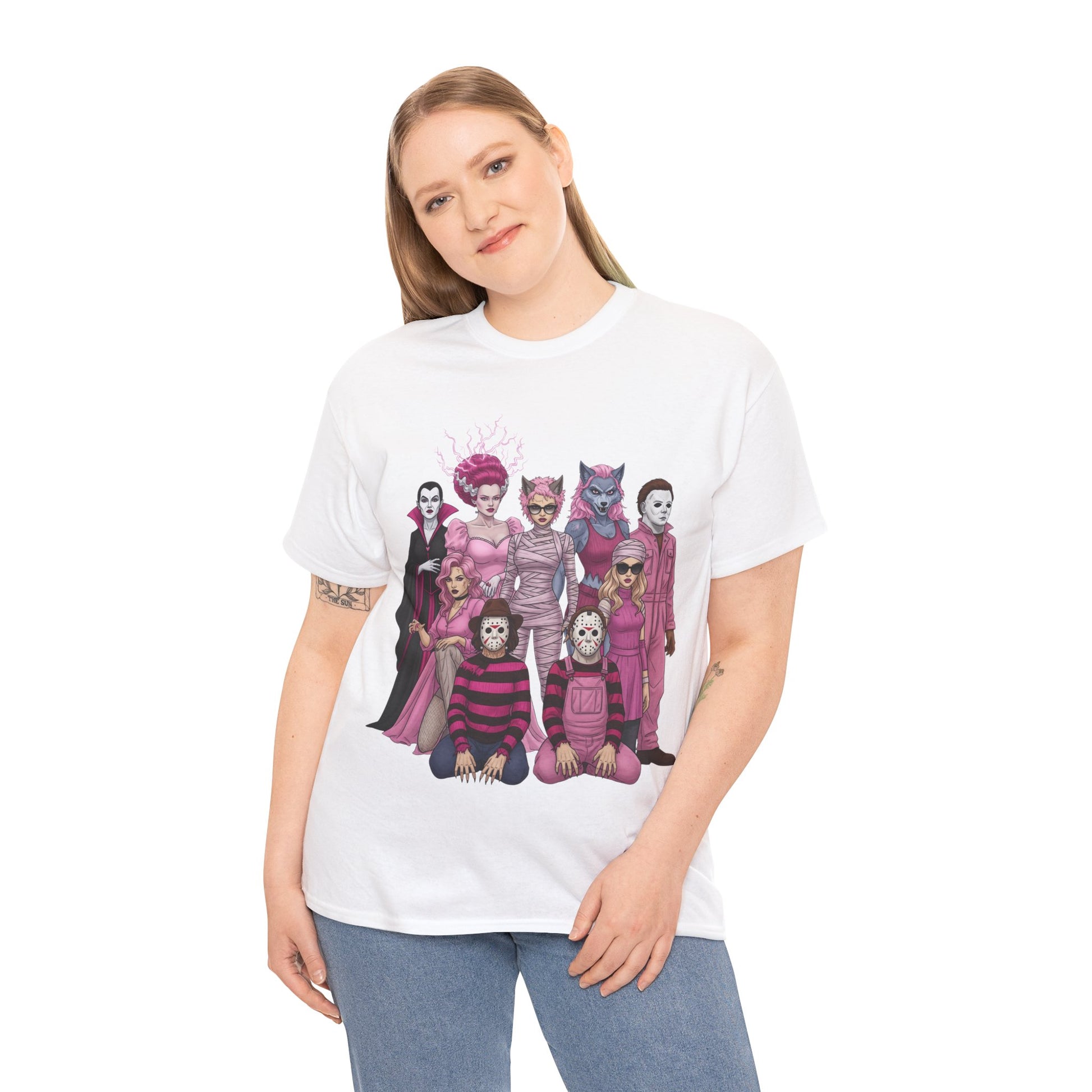This design is drenched in shades of pink for a very important reason. October is not only the month of Halloween, but also Breast Cancer Awareness Month. The vibrant pink palette is our tribute to the fierce spirit of the fighters, survivors, and loved ones in that battle. Each shirt stands as a symbol of solidarity, weaving together the fantasy of horror with the real-world strength and resilience of women everywhere.