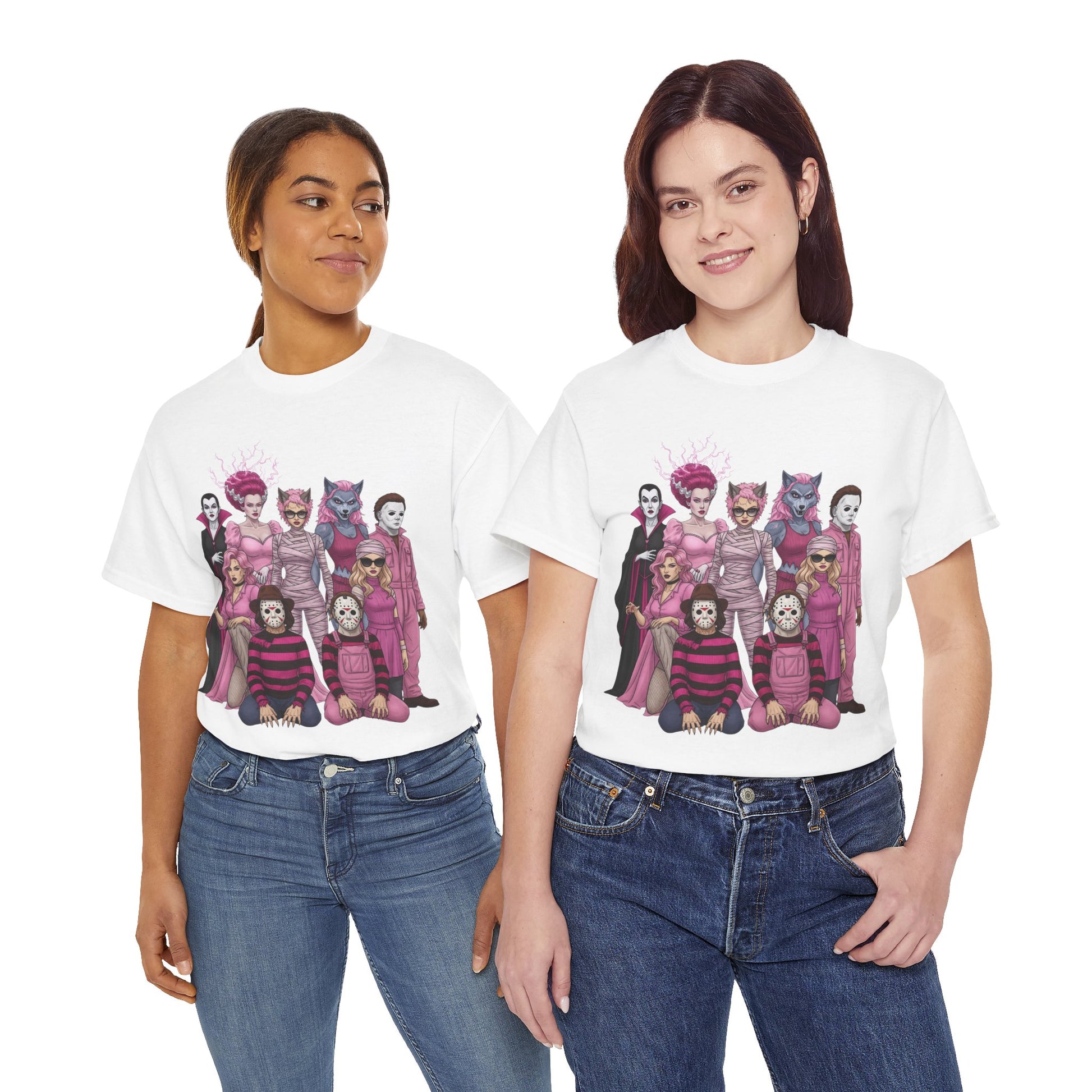 Lady Slashers Halloween Tee | Female Horror Villains Reunion Shirt in Pink