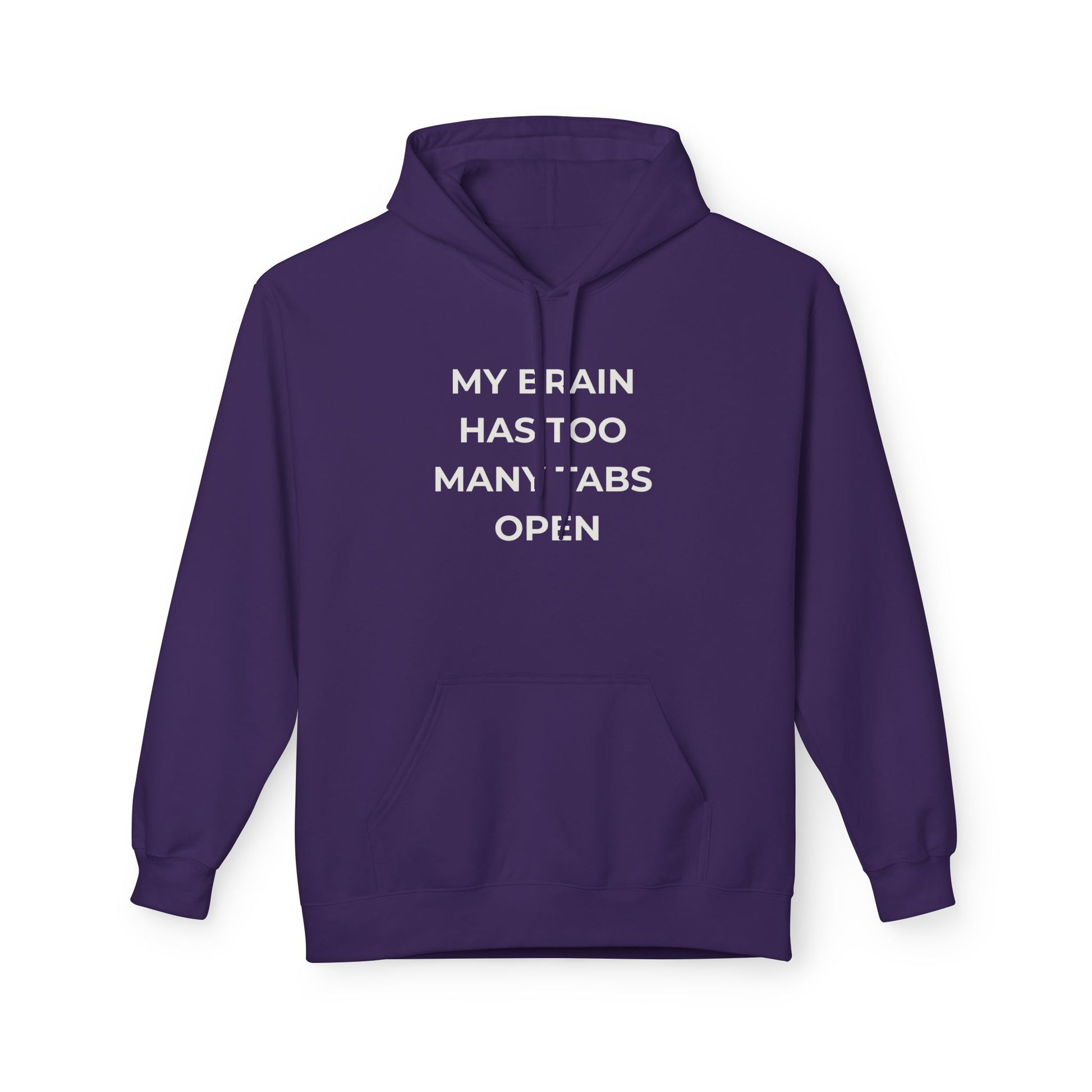 This midweight fleece hoodie feels like a warm pause in a busy day. The rich brown fabric and understated white text — "MY BRAIN HAS TOO MANY TABS OPEN" — capture that scatterbrained, coffee-fueled humor while staying cozy and calm. The relaxed dropped shoulders and pouch pocket invite you to shrug into slow comfort. Wear it while you settle in for a work sprint, a late-night study session, or a weekend of errands; it reads like an honest, wry note to yourself that others will smile at. Thoughtfully made with sustainable and socially conscious practices, the hoodie sits comfortably between loungewear and laid-back streetwear — approachable, well-made, and quietly relatable.