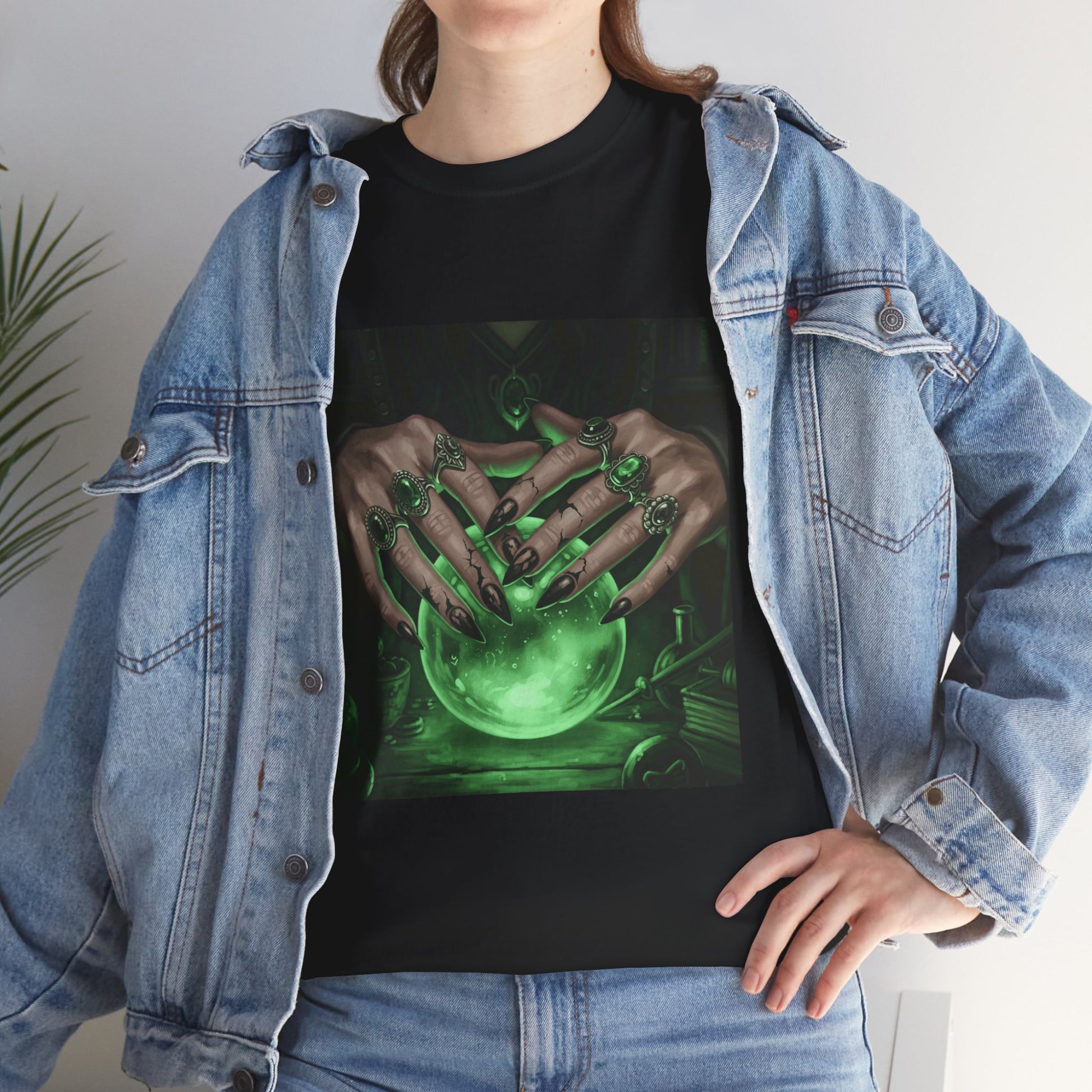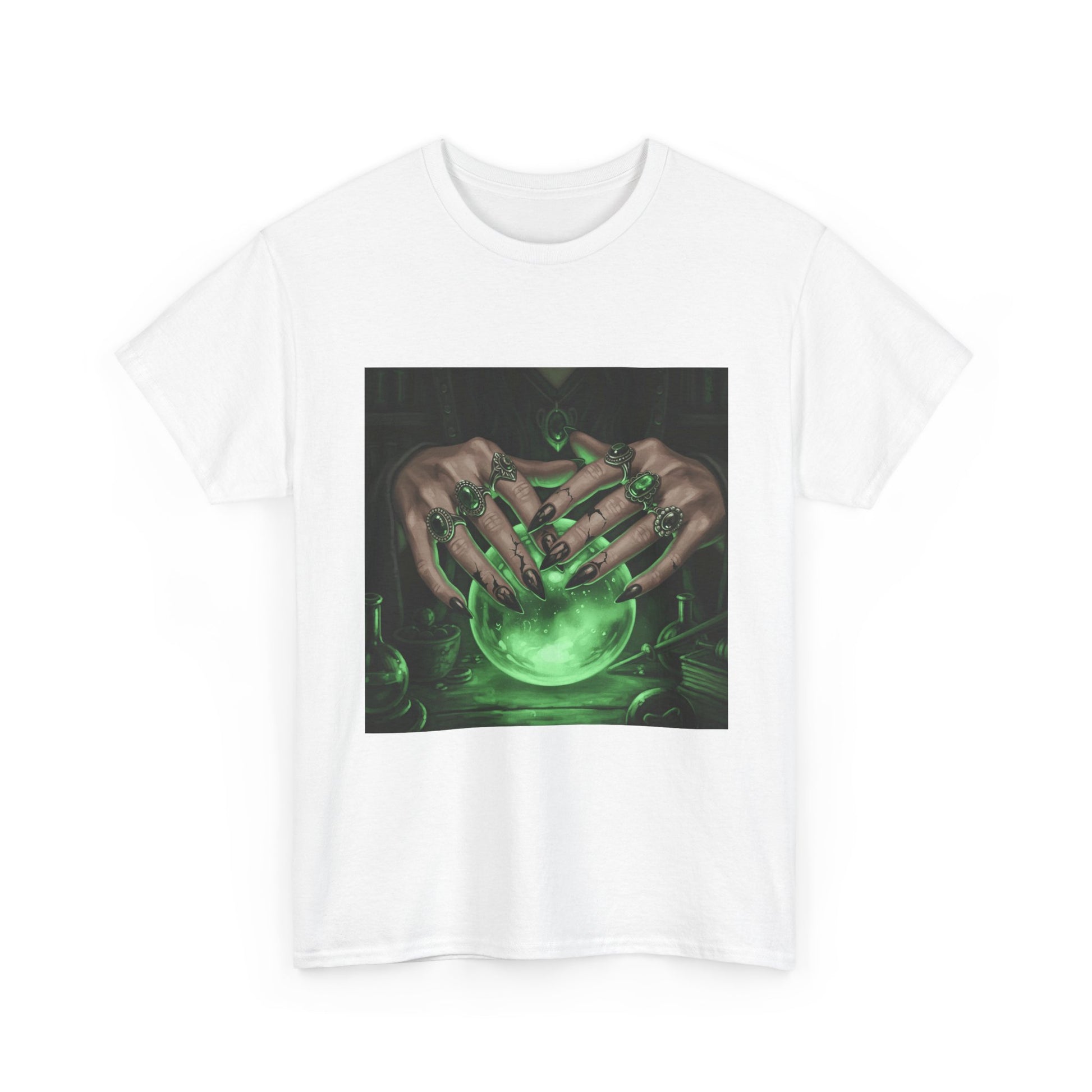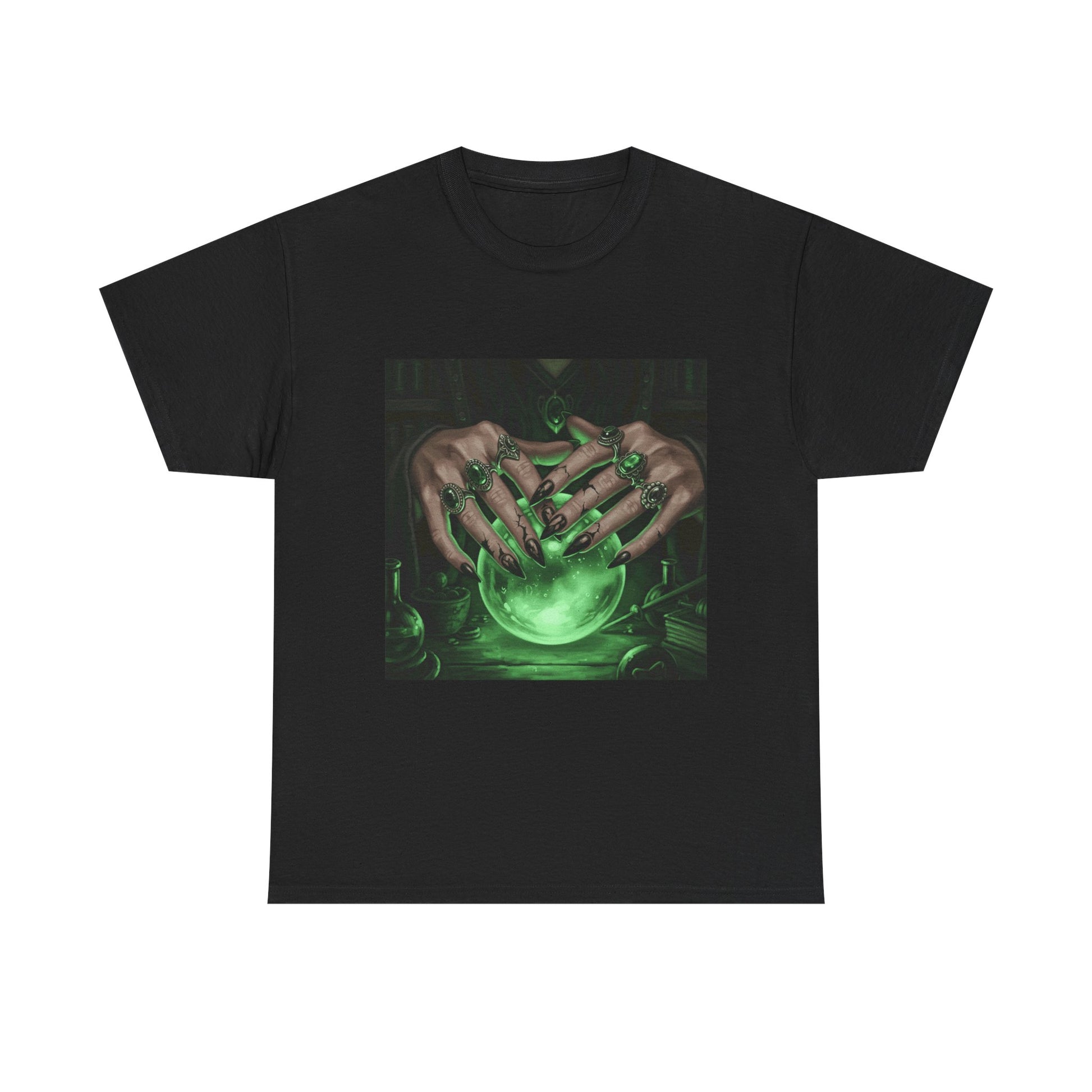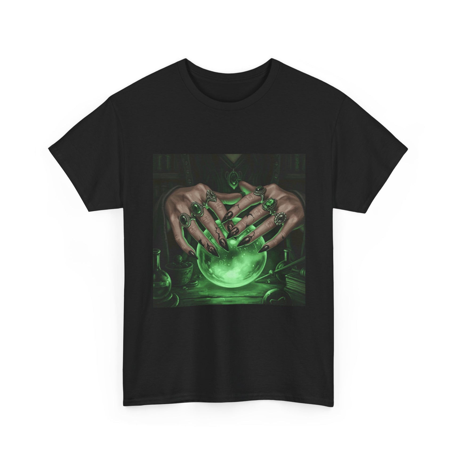 Dive into the mystical with this stunning digital art print. A powerful sorceress's hands, adorned with intricate rings, hold a luminous green crystal ball. Perfect for fans of fantasy, dark magic, and occult art. This magical design adds a touch of enchantment to any collection.