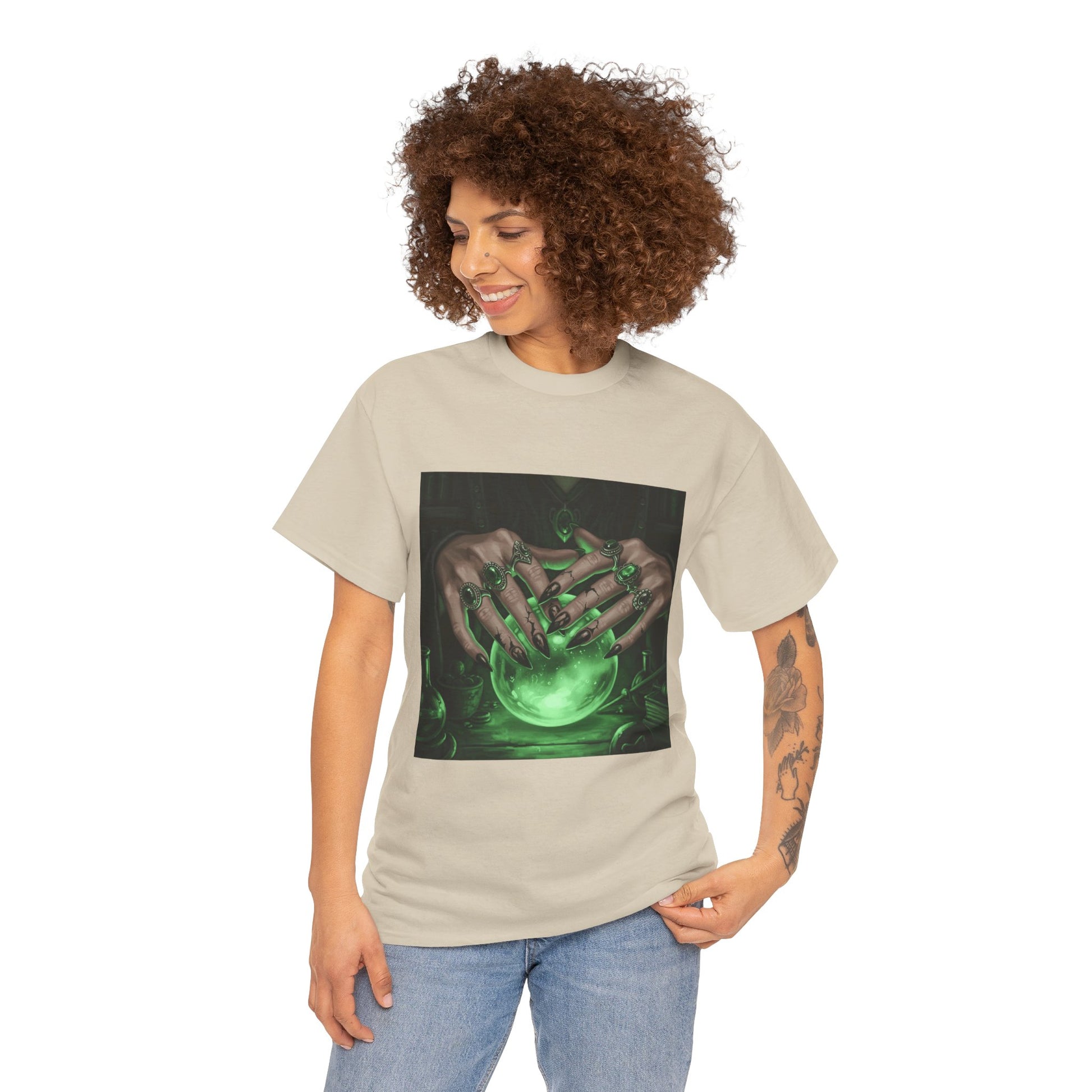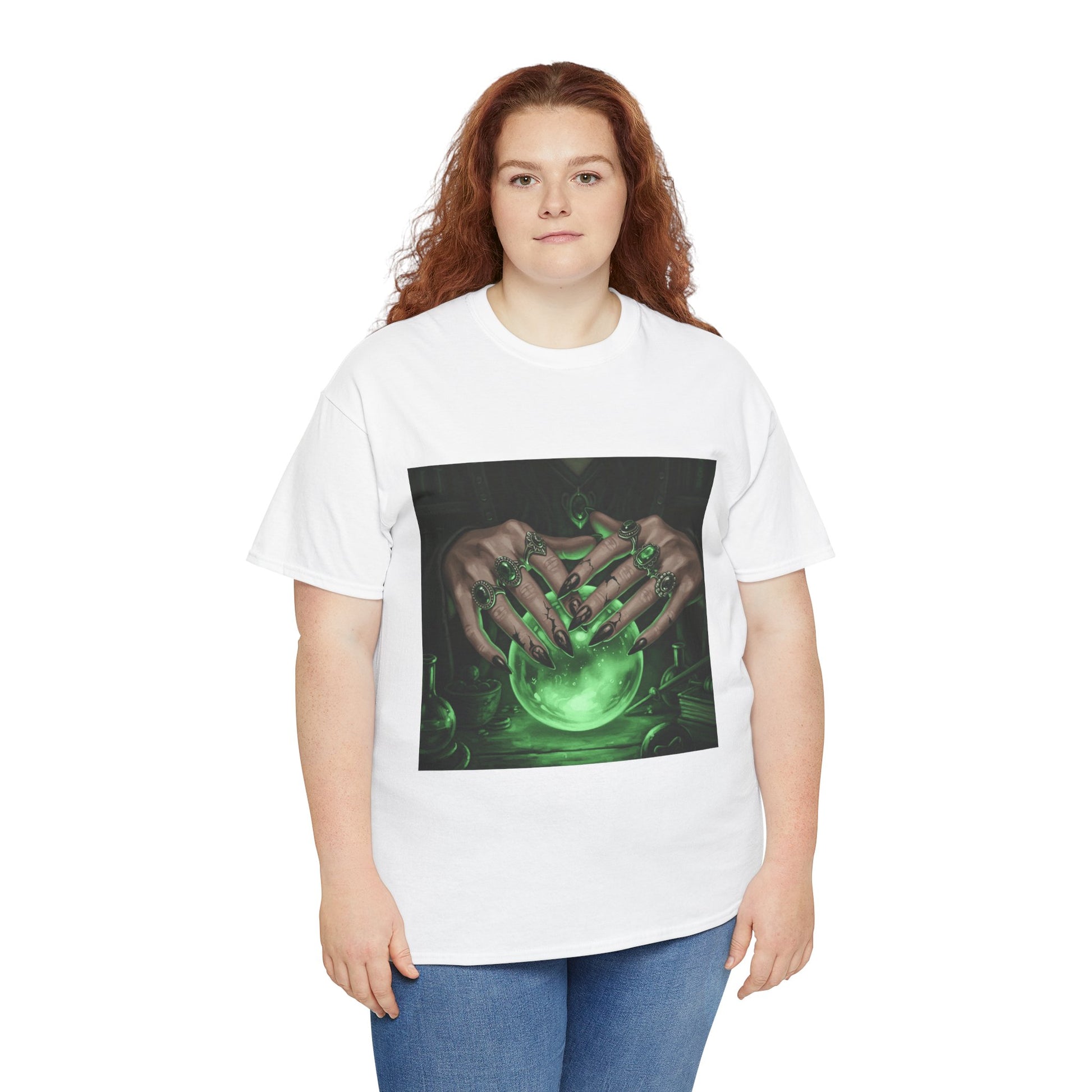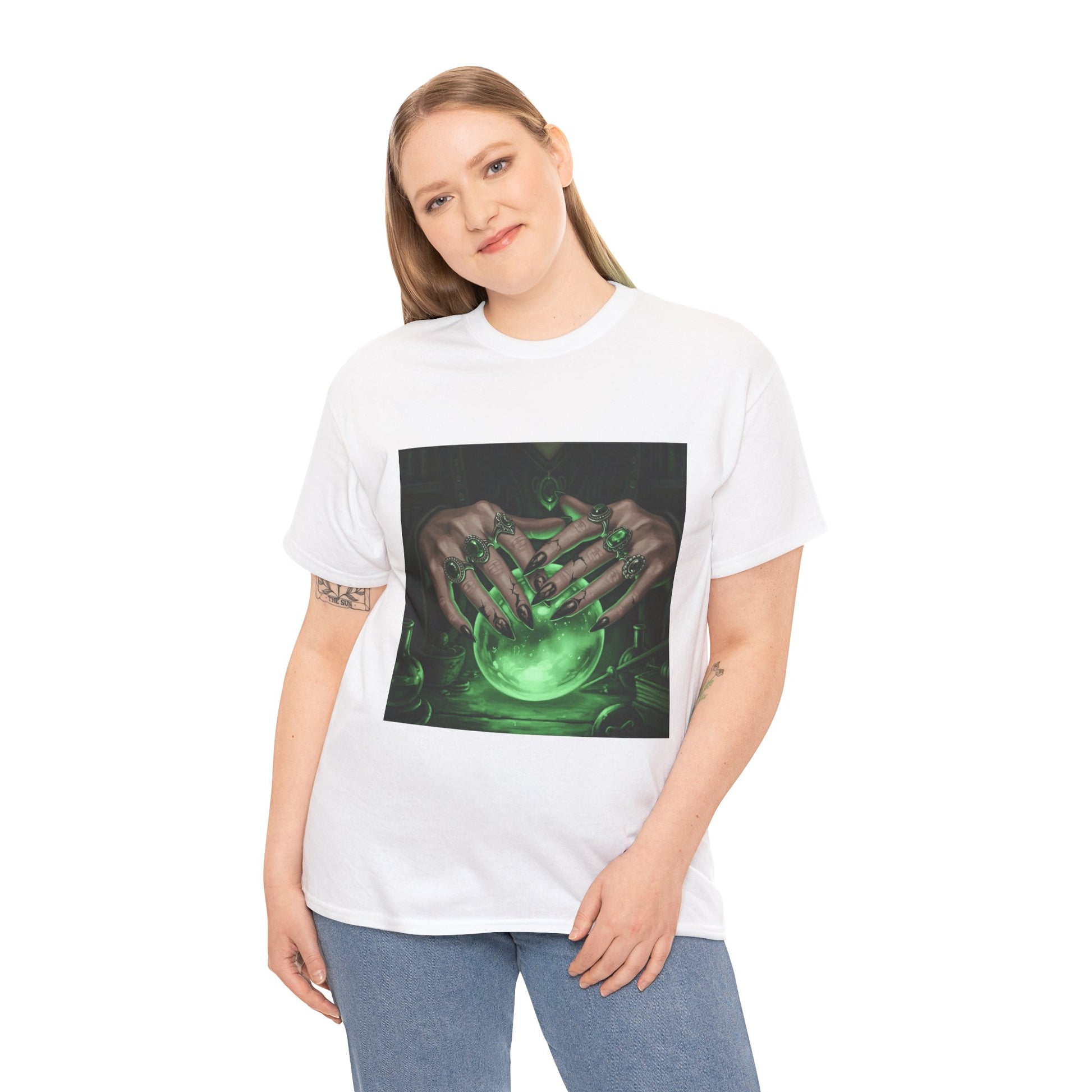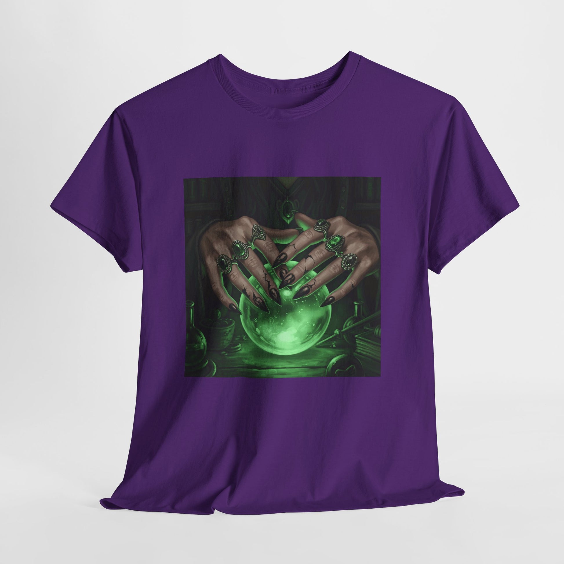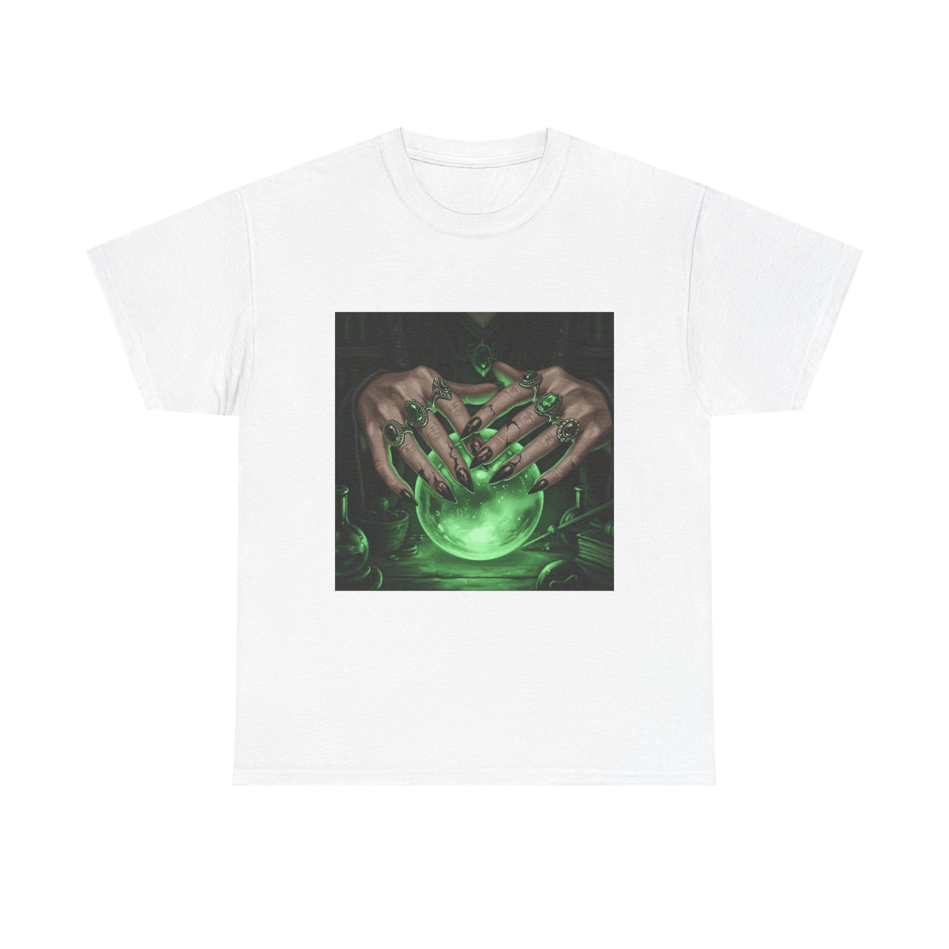 Dive into the mystical with this stunning digital art print. A powerful sorceress's hands, adorned with intricate rings, hold a luminous green crystal ball. Perfect for fans of fantasy, dark magic, and occult art. This magical design adds a touch of enchantment to any collection.