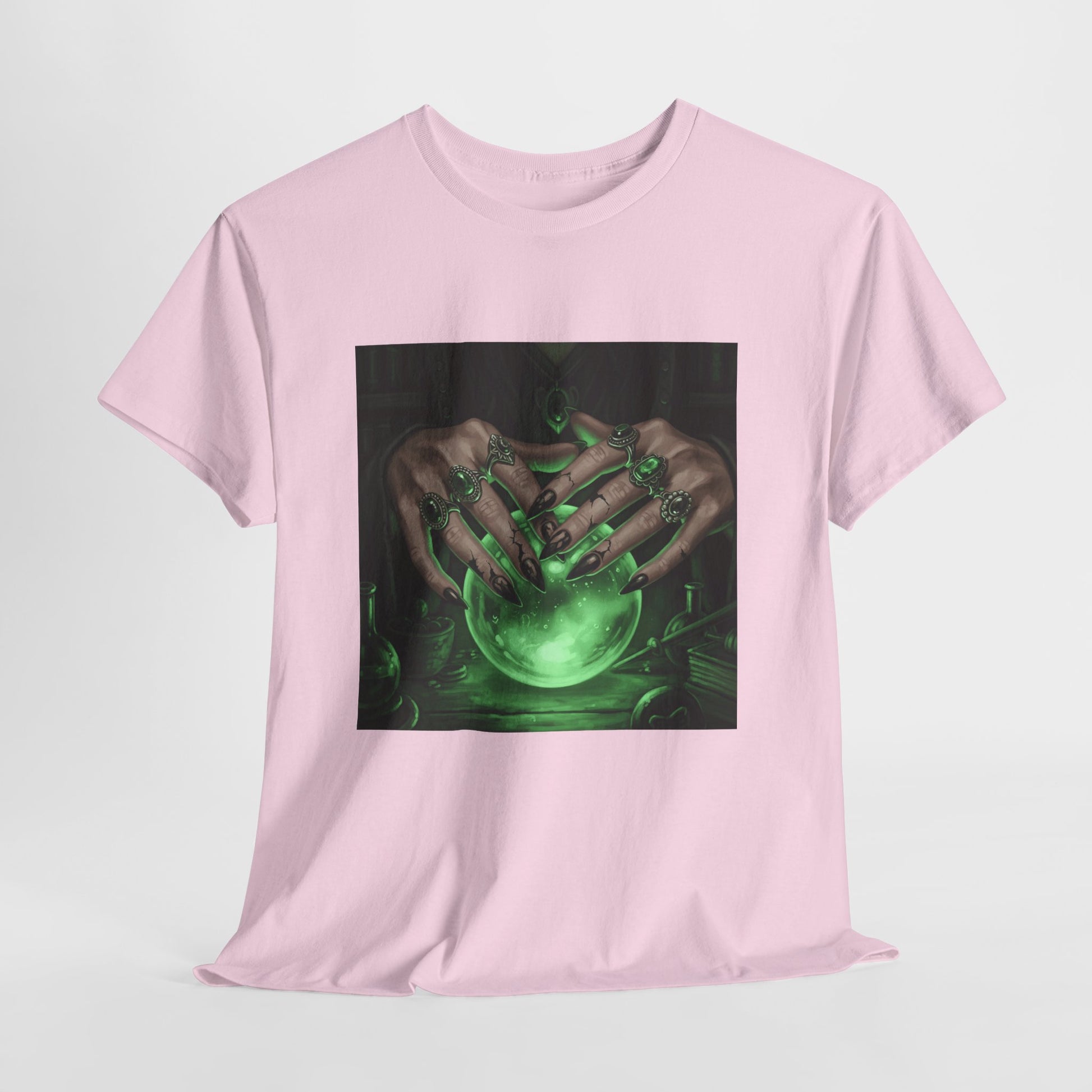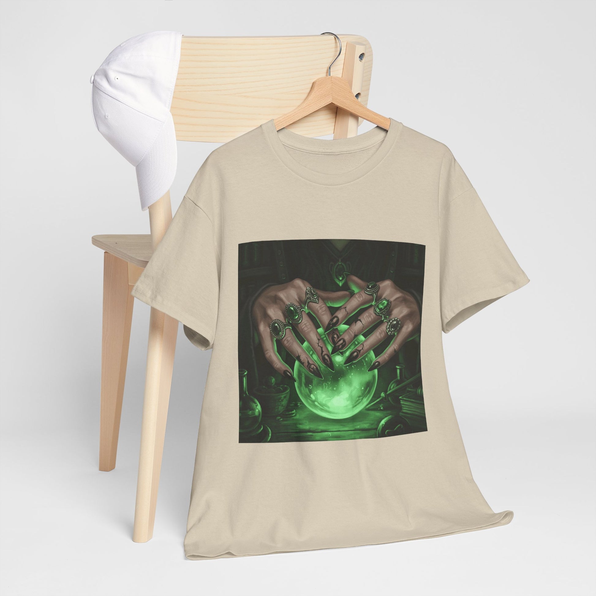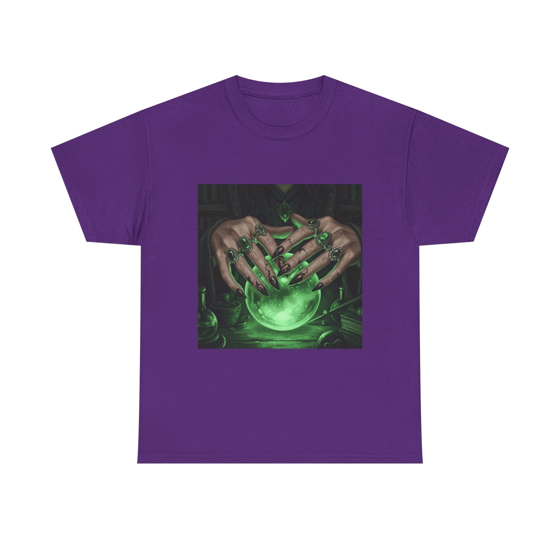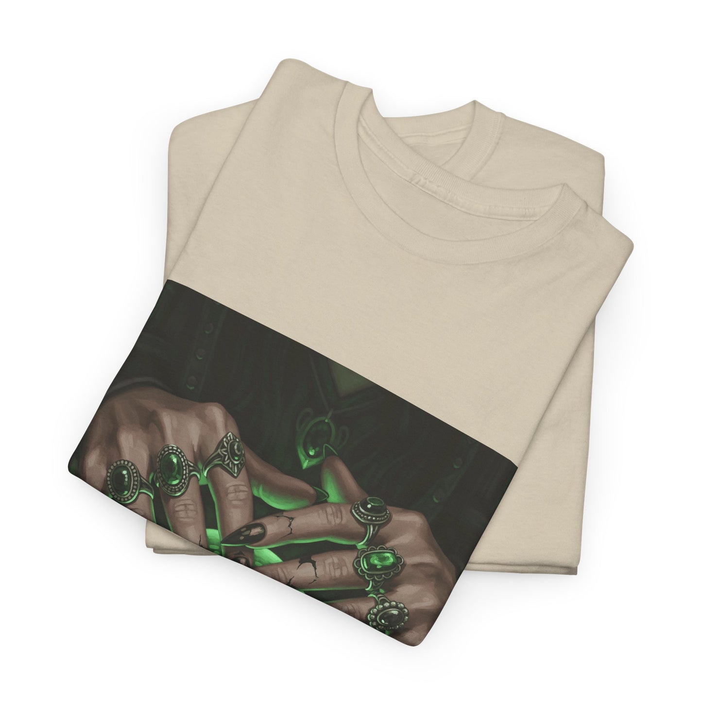 Dive into the mystical with this stunning digital art print. A powerful sorceress's hands, adorned with intricate rings, hold a luminous green crystal ball. Perfect for fans of fantasy, dark magic, and occult art. This magical design adds a touch of enchantment to any collection.
