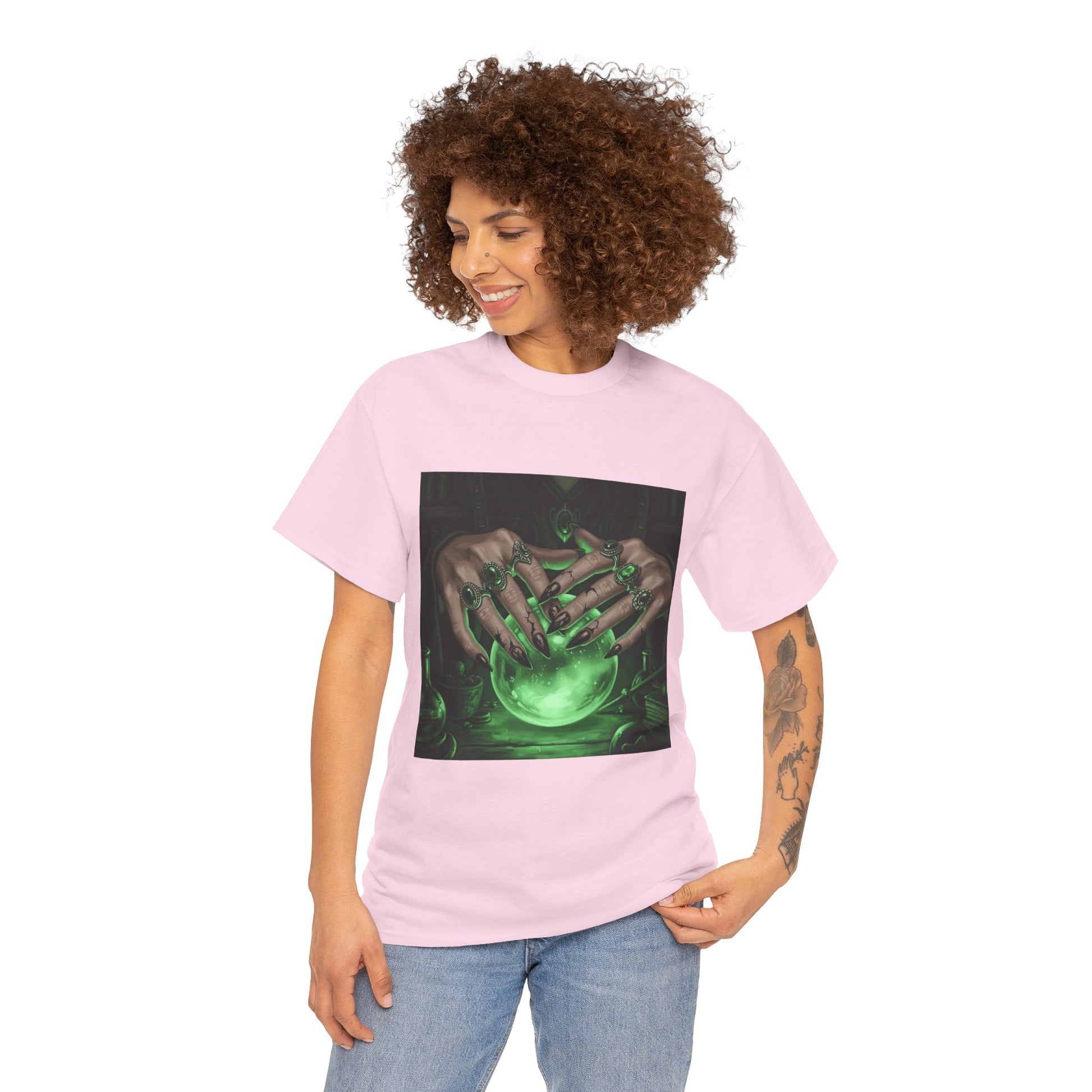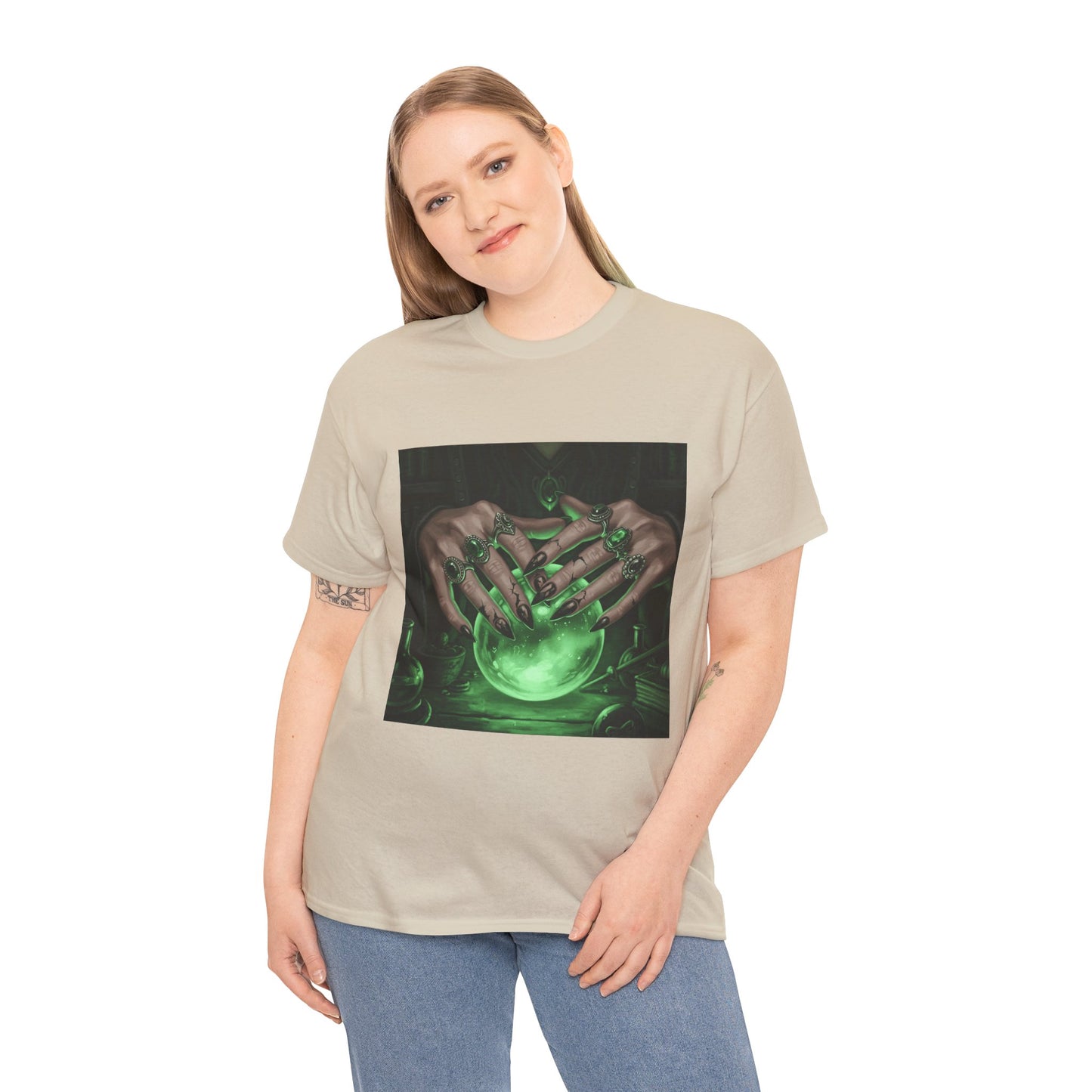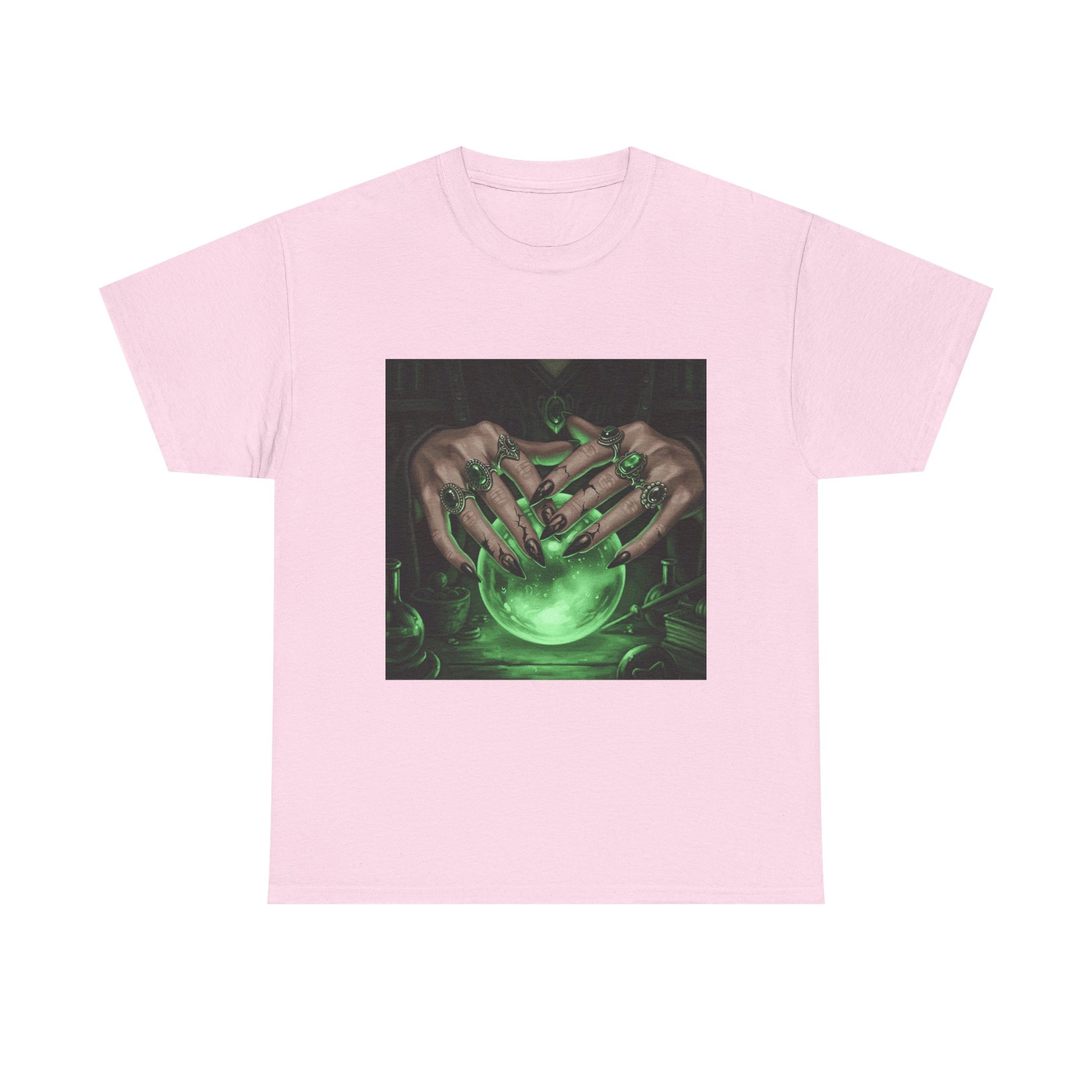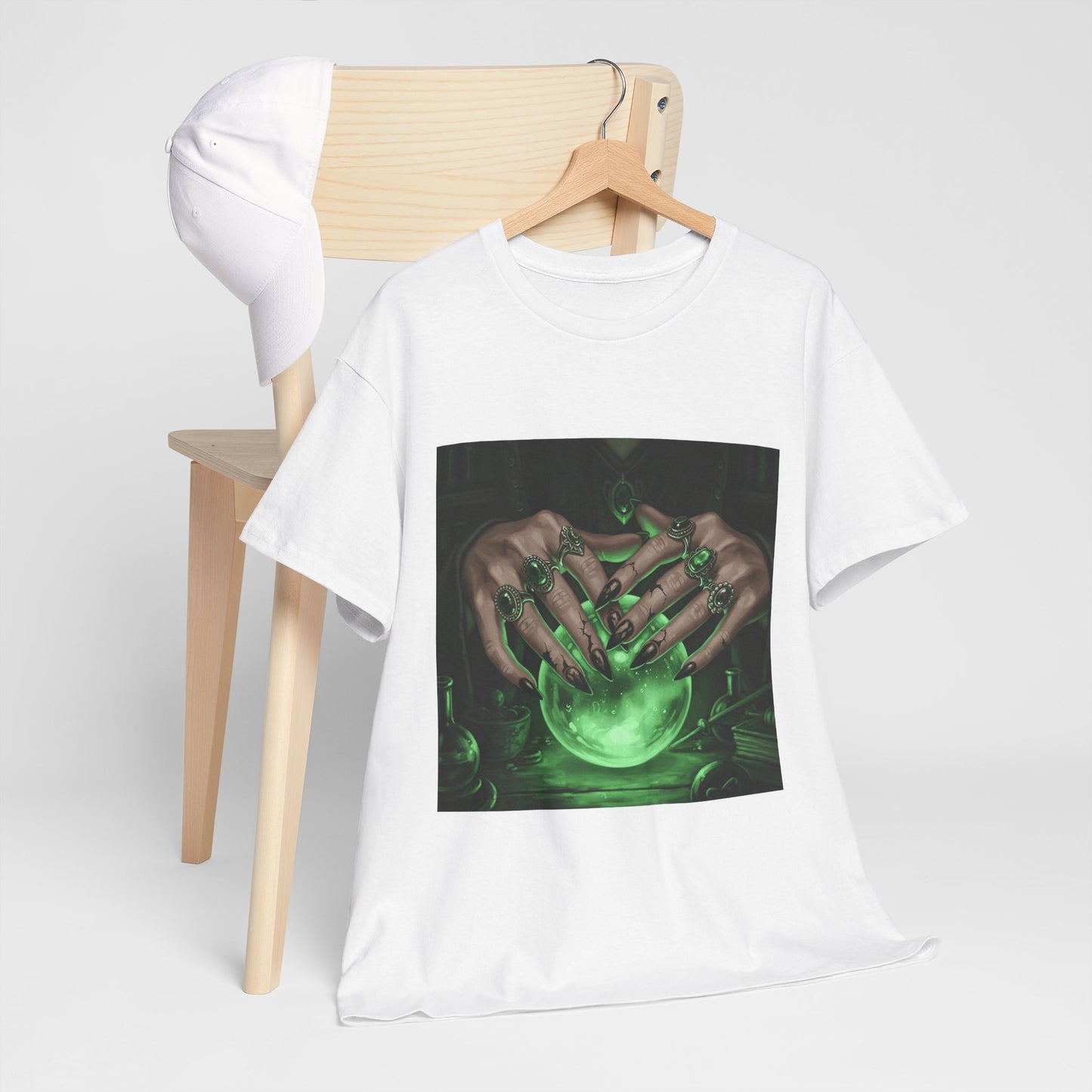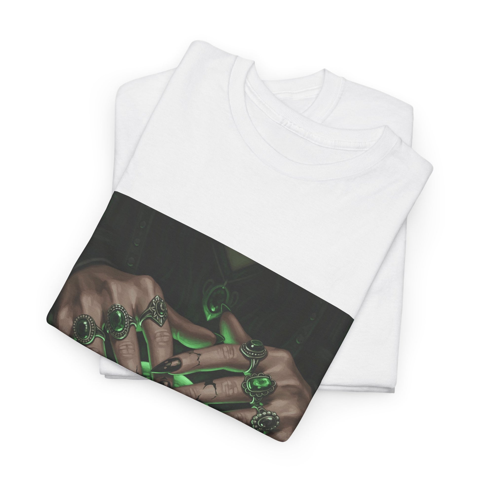 Dive into the mystical with this stunning digital art print. A powerful sorceress's hands, adorned with intricate rings, hold a luminous green crystal ball. Perfect for fans of fantasy, dark magic, and occult art. This magical design adds a touch of enchantment to any collection.