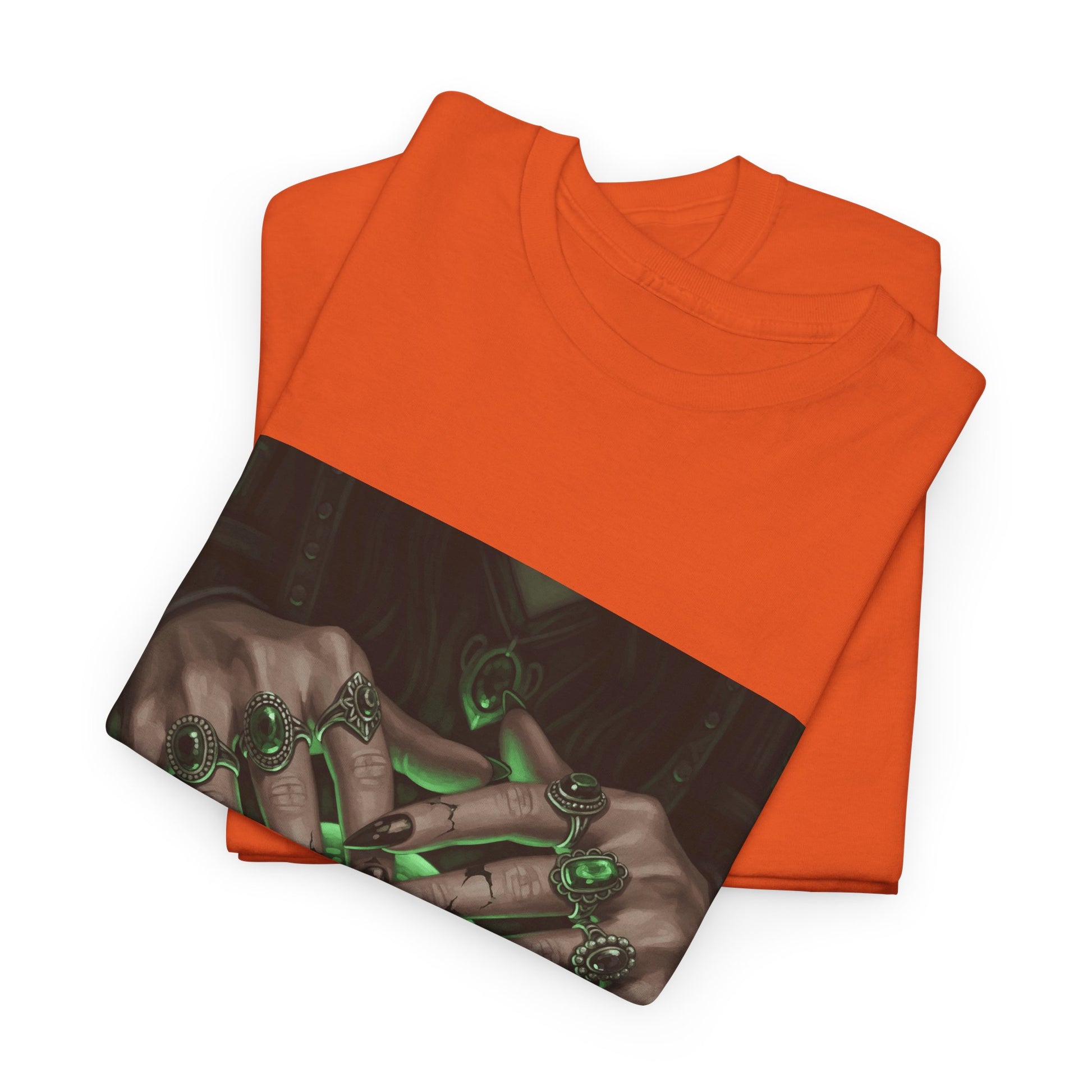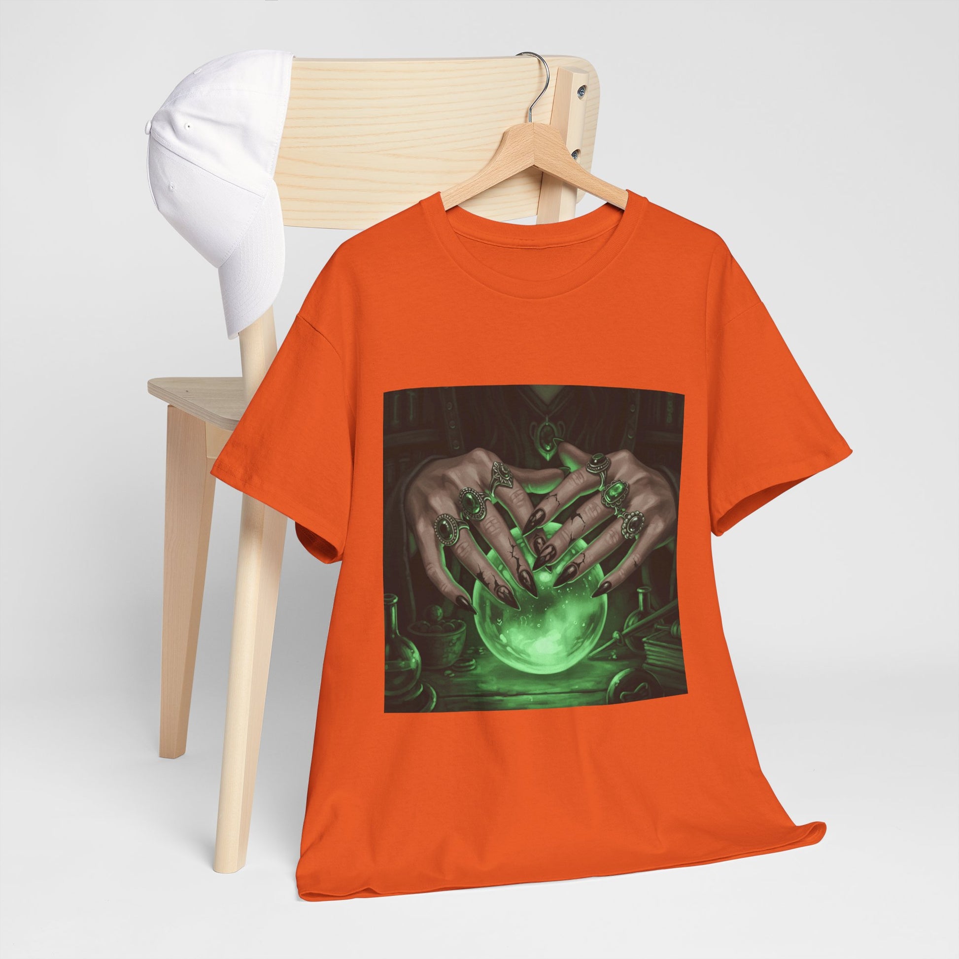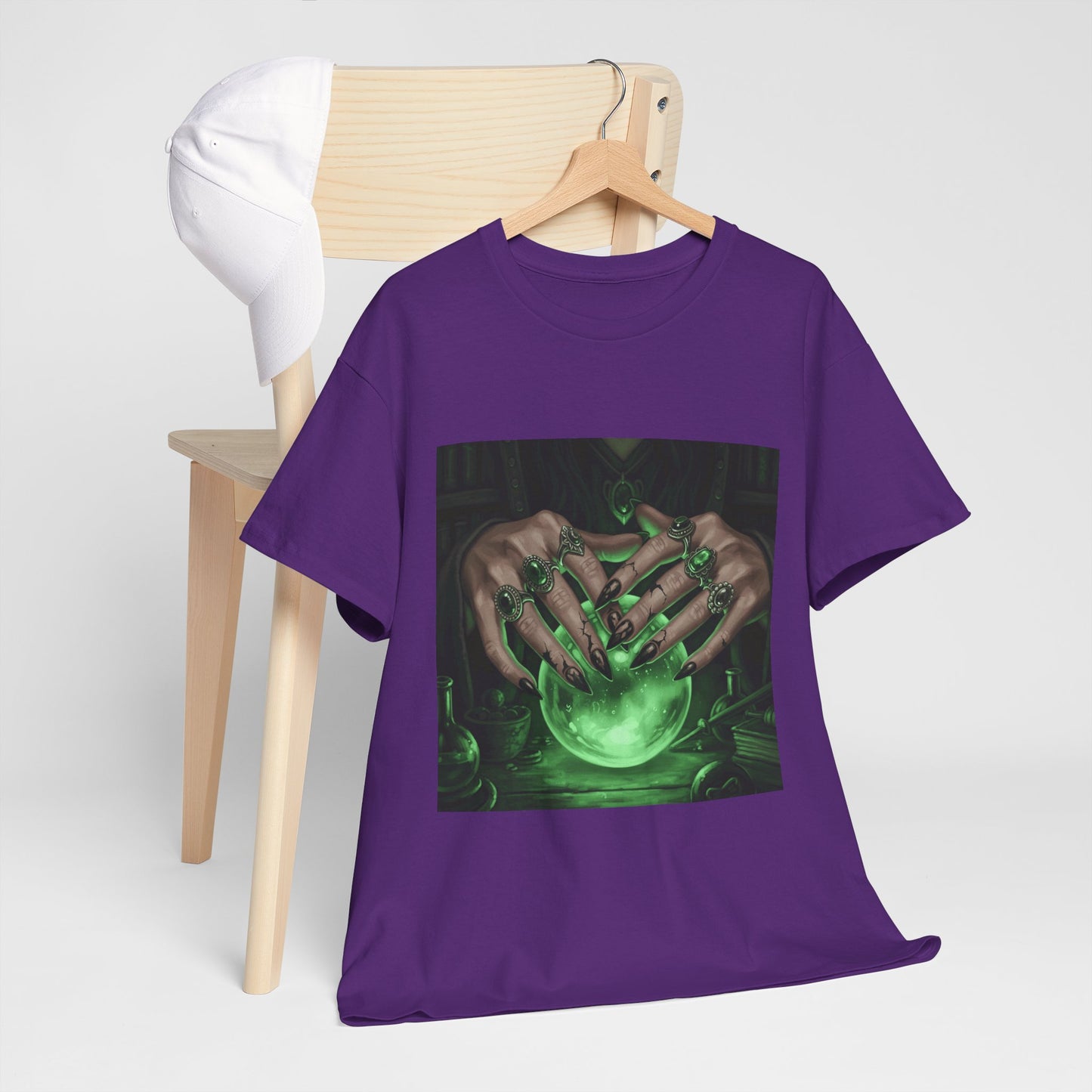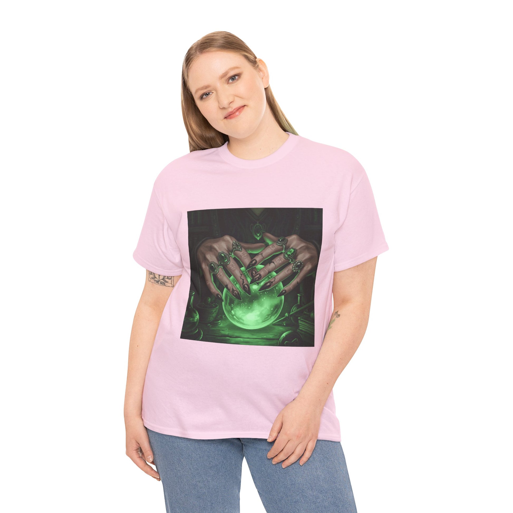 Dive into the mystical with this stunning digital art print. A powerful sorceress's hands, adorned with intricate rings, hold a luminous green crystal ball. Perfect for fans of fantasy, dark magic, and occult art. This magical design adds a touch of enchantment to any collection.