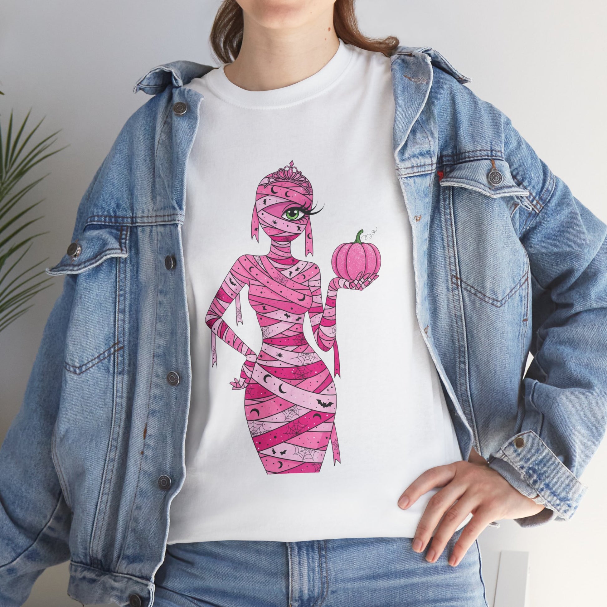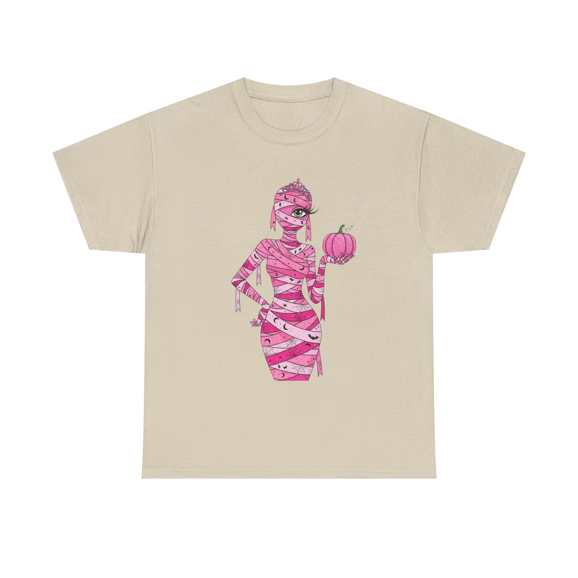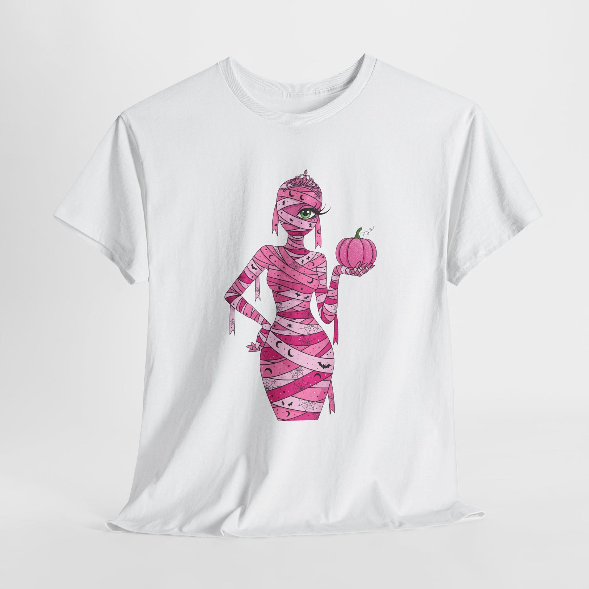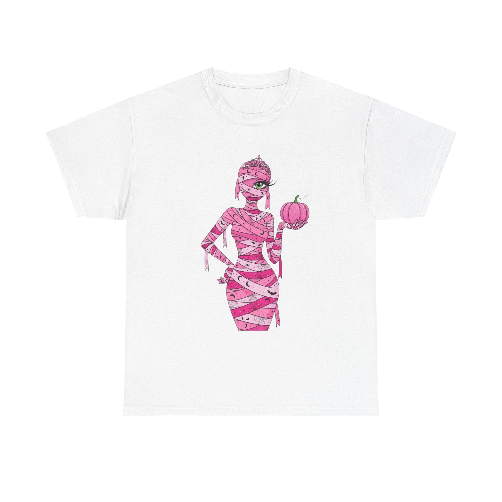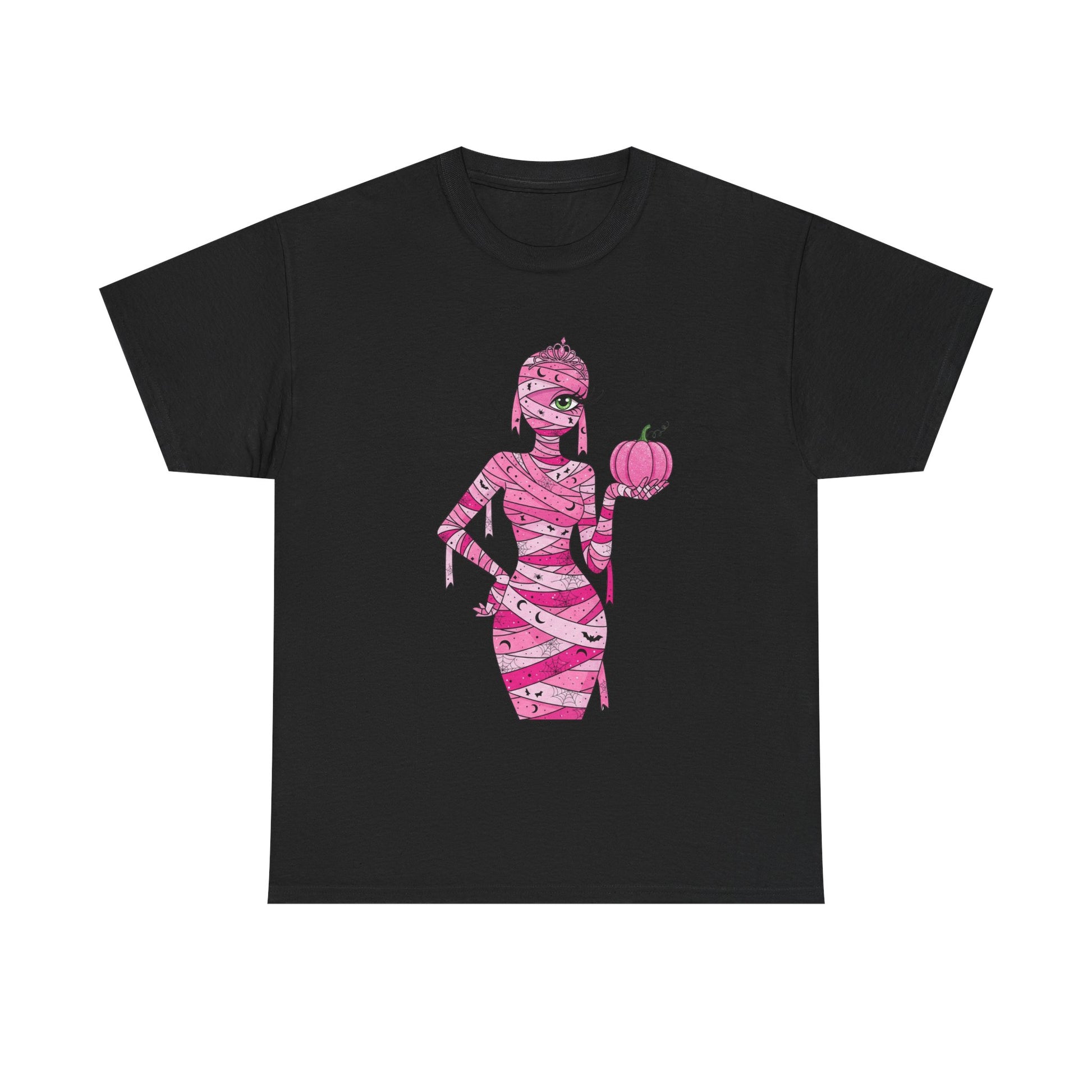Her ancient wrappings are reimagined as ribbons of solidarity, and her royal tiara celebrates the warrior spirit of every person who has faced cancer. This design is perfect for anyone who loves a "spooky cute" aesthetic and wants to show their support for an important cause. Wear it to a Halloween party or throughout the month to share a message of resilience and hope.