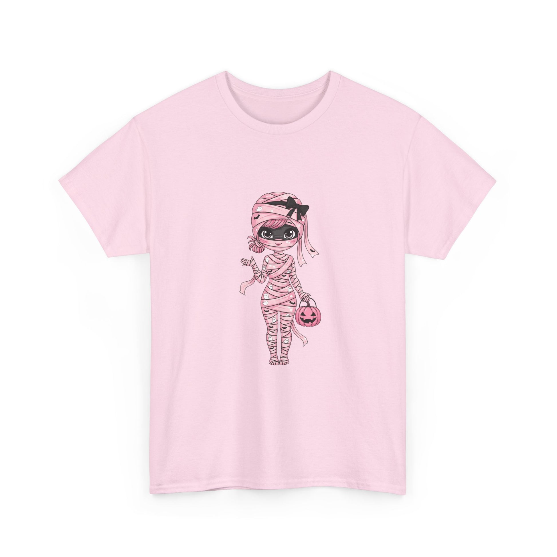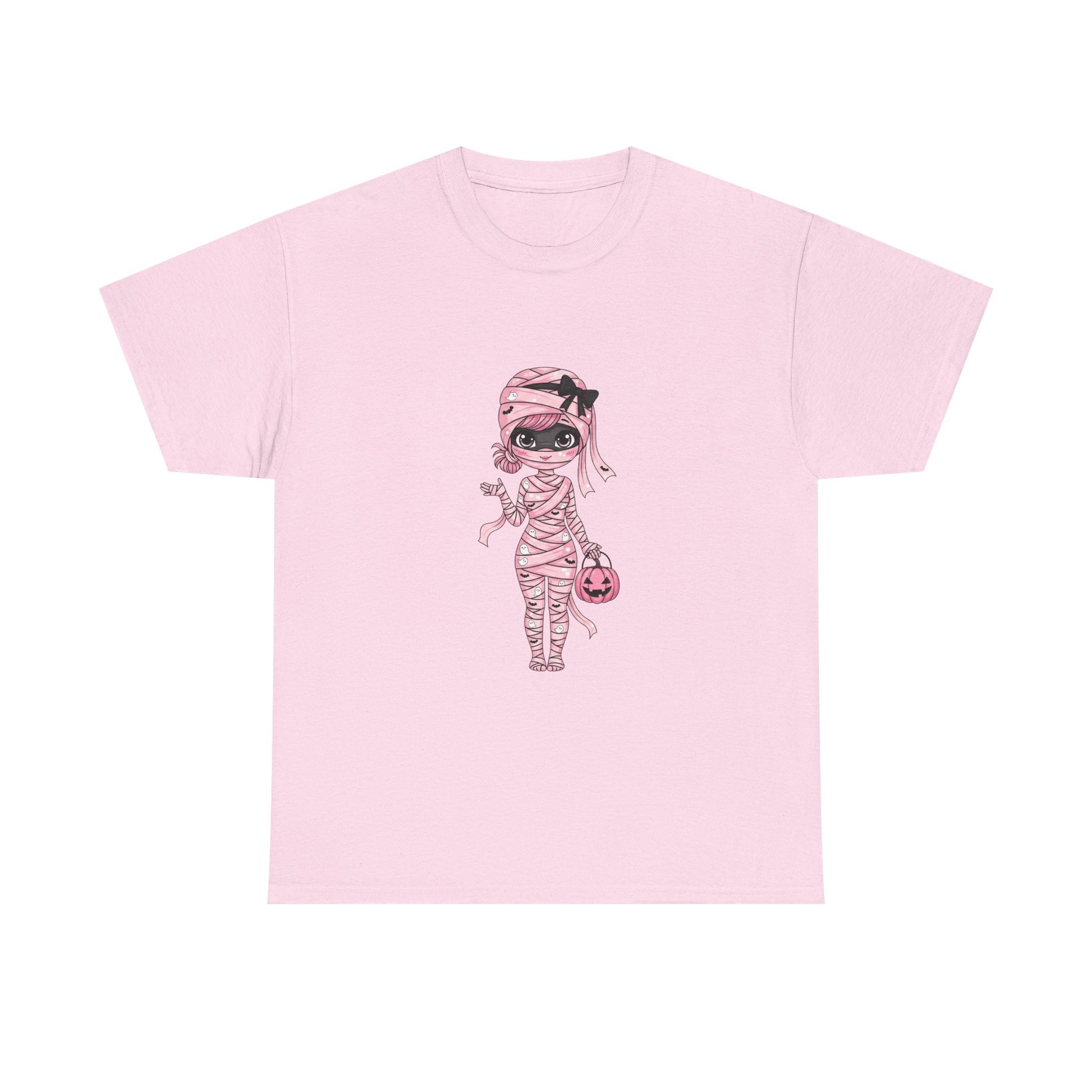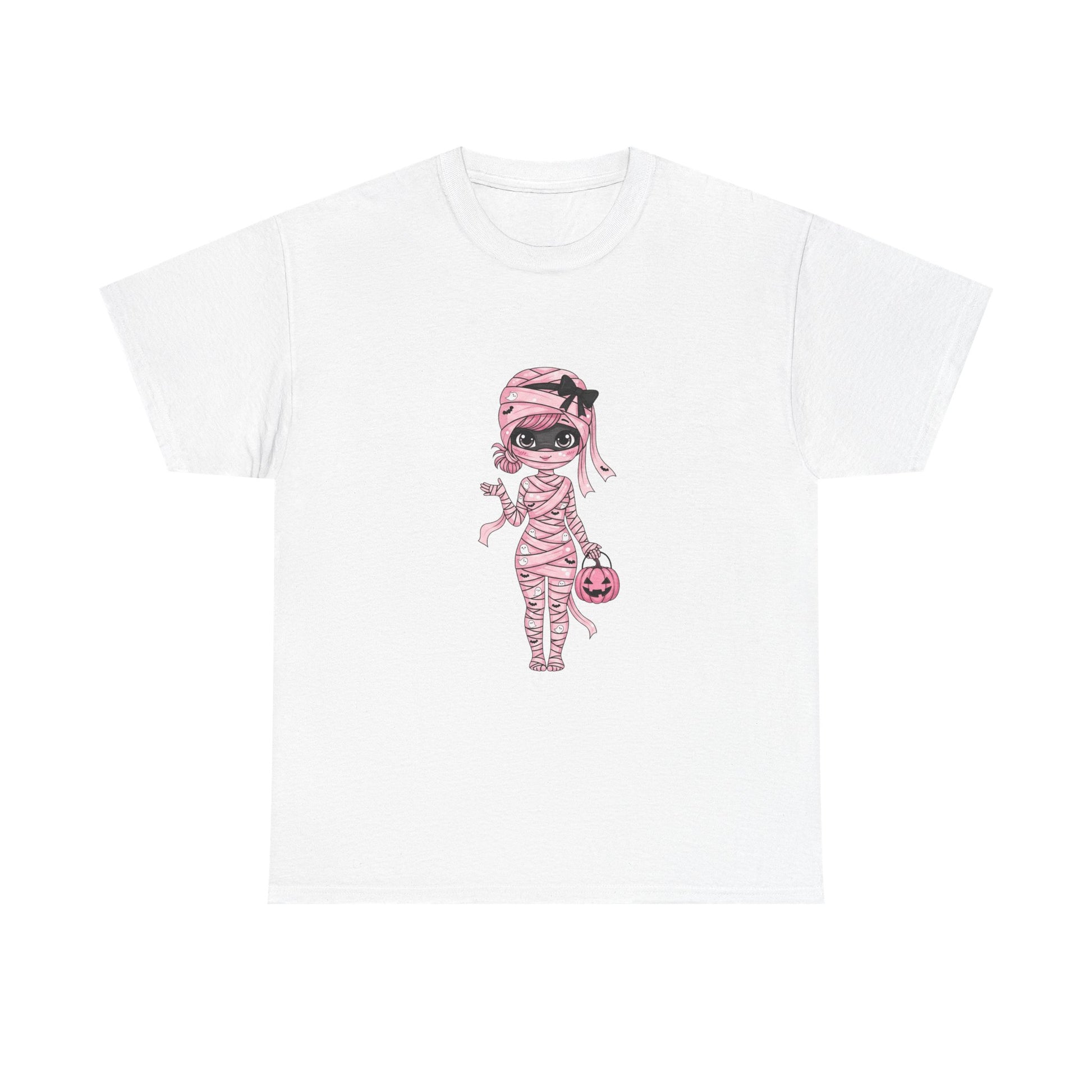 Get wrapped up in hope this October! This adorable design features a chibi-style mummy girl, ready for a night of Halloween trick-or-treating with her pink jack-o'-lantern bucket.