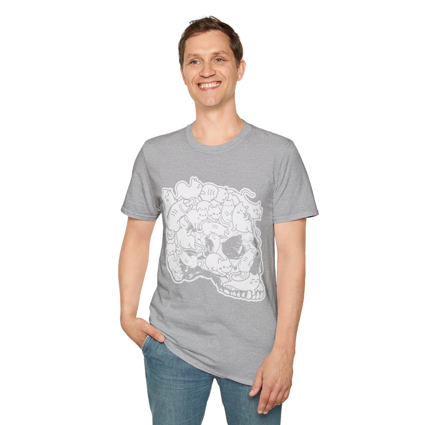 Unleash your love for felines and the spooky season with our “Spooky Halloween Skull - Cats, Galore T-shirt”! This one-of-a-kind t-shirt boasts an eye-catching design where playful kitties come together to form an eerie skull silhouette. Each cat’s distinct pose adds to the intricate detail of this artistic creation, making it not just apparel but a conversation starter at every fall gathering.