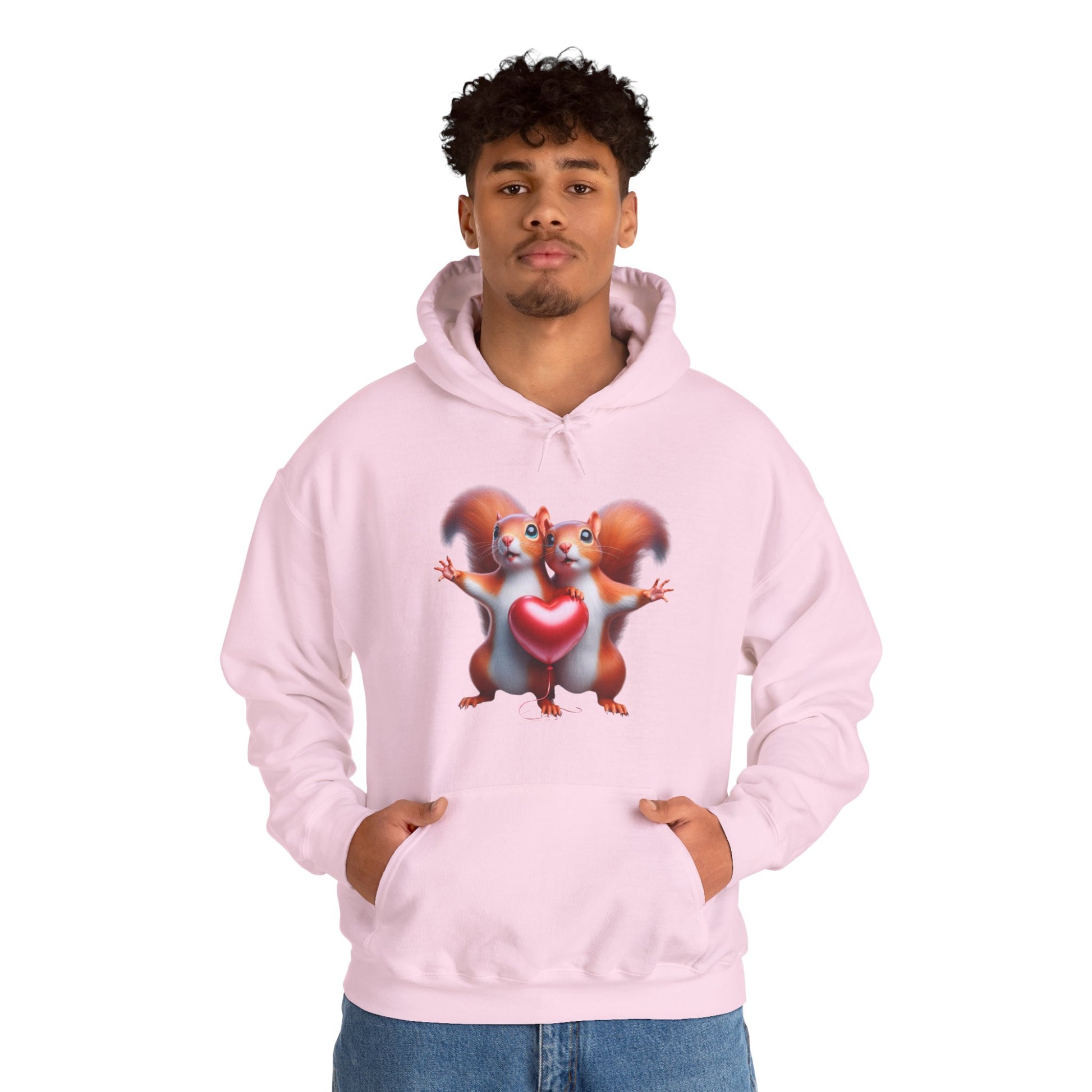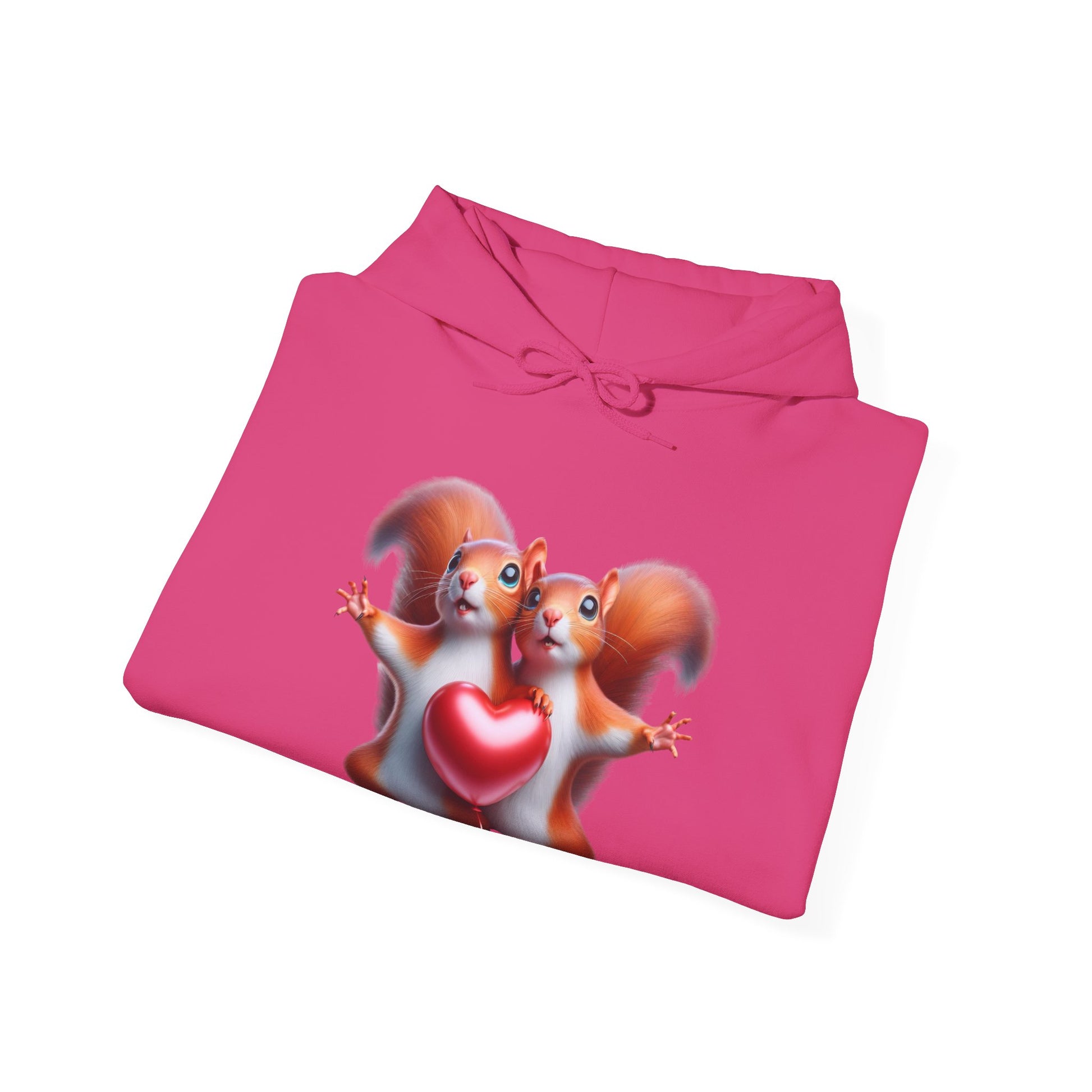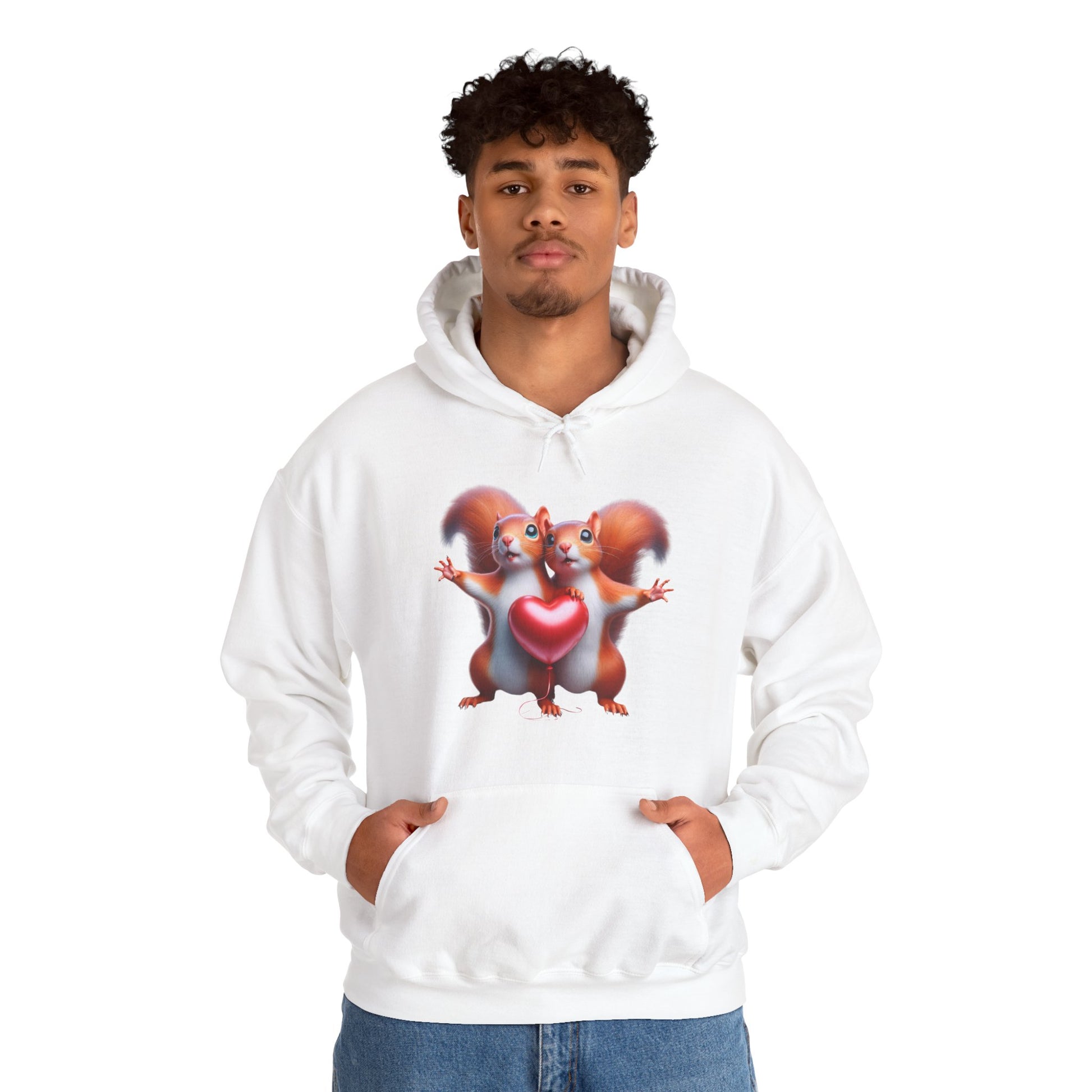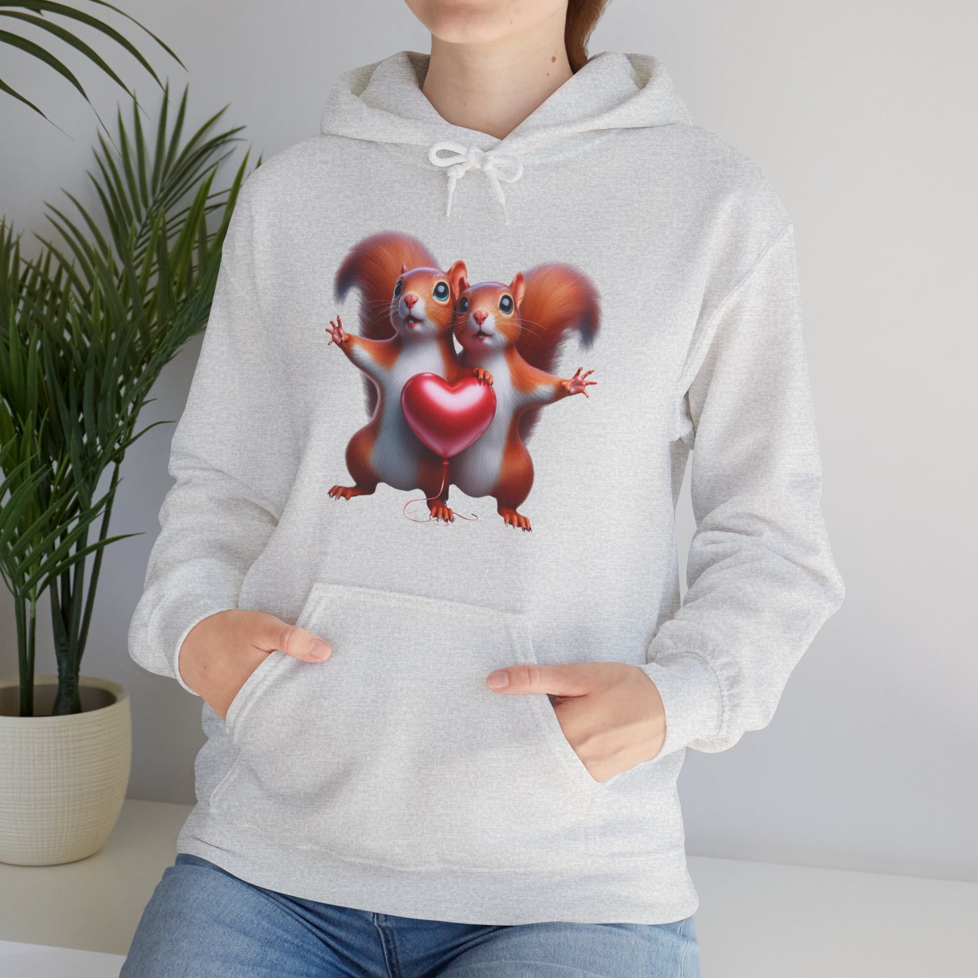 Snuggle up in this charming hoodie with a lively illustration of a squirrel couple holding a heart, perfect for couples or cute animal fans seeking comfort and whimsy. Crafted from plush 50/50 cotton-polyester (8.0 oz/yd², 271 g/m²), it provides soft warmth and style for everyday wear or gifting.