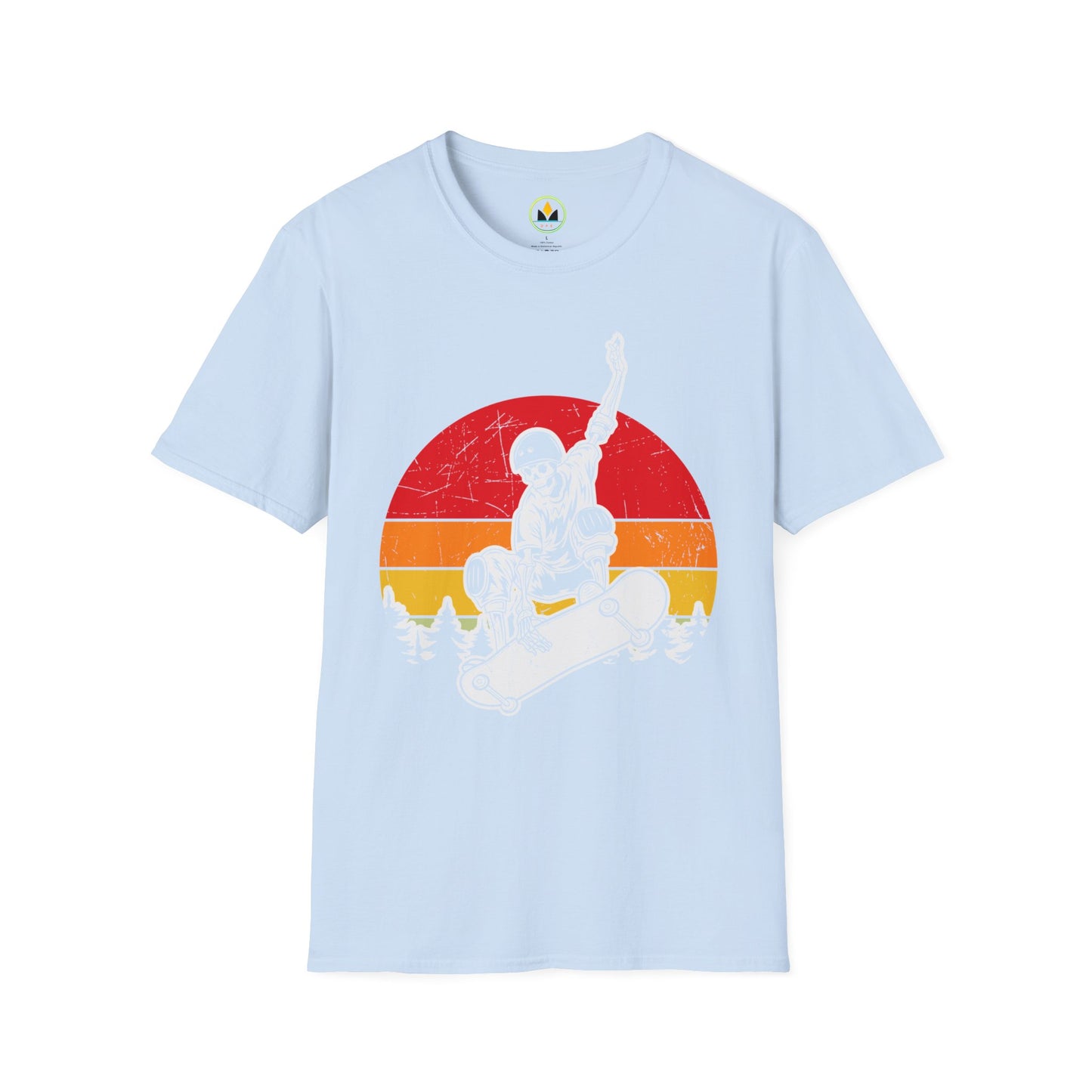 Embrace the spirit of adventure this Halloween with our “Sunset Skateboarder - Vintage Halloween Tee”! This unique T-shirt features a dynamic skateboarder silhouette set against a vibrant sunset backdrop, capturing the essence of outdoor thrill and the spooky season. The design is complemented by a distressed texture, giving it a vintage or worn look. Whether you’re out trick-or-treating or attending a casual costume party, this shirt is sure to be a conversation starter!